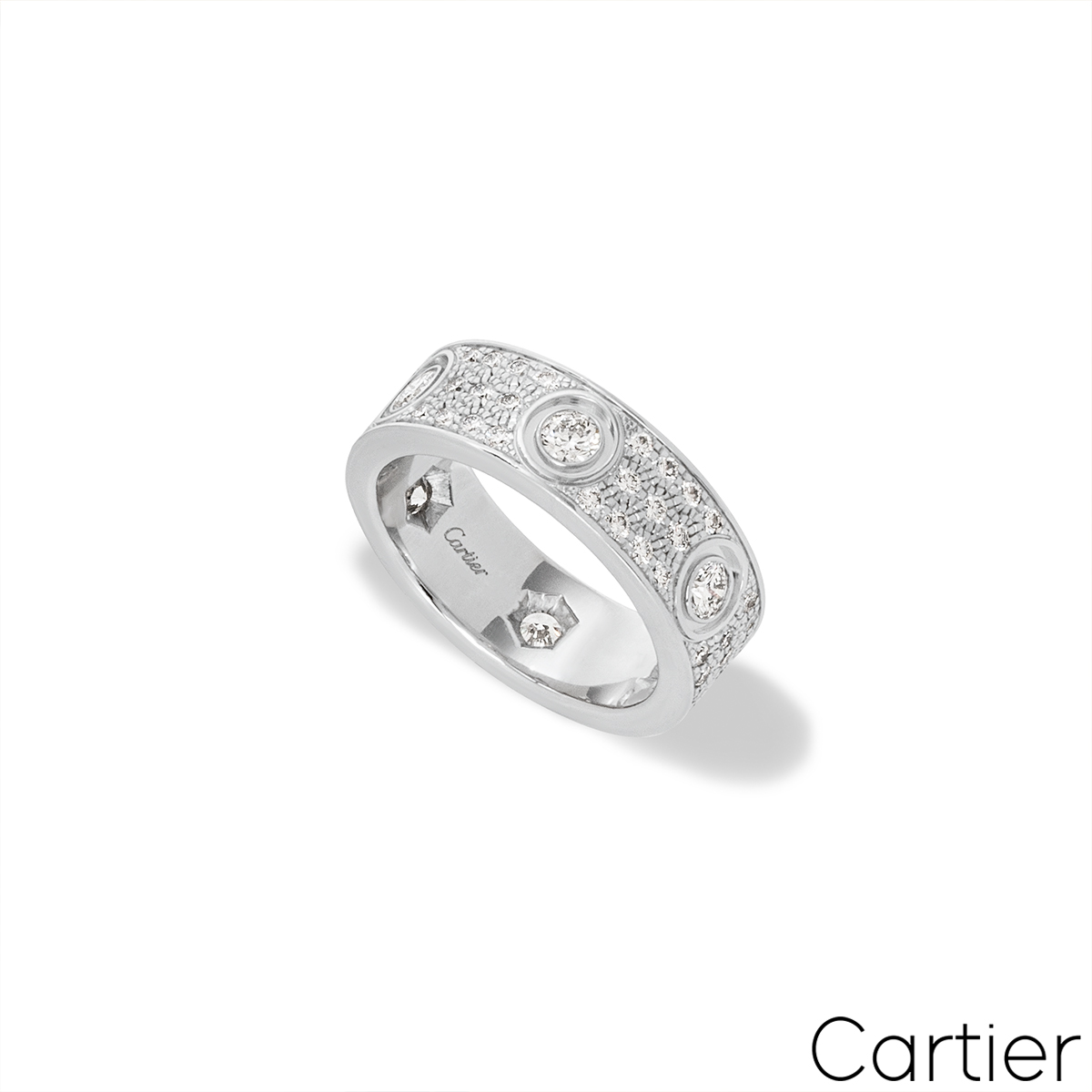 An 18k white gold diamond ring by Cartier from the Love collection. The ring has 6 round brilliant cut diamonds bezel set around the outer edge and 66 round brilliant cut diamonds pave set throughout, with a total weight of approximately 1.26ct, E-F colour and VS clarity. The 6.5mm ring is a size 52 and has a gross weight of 10.02 grams.