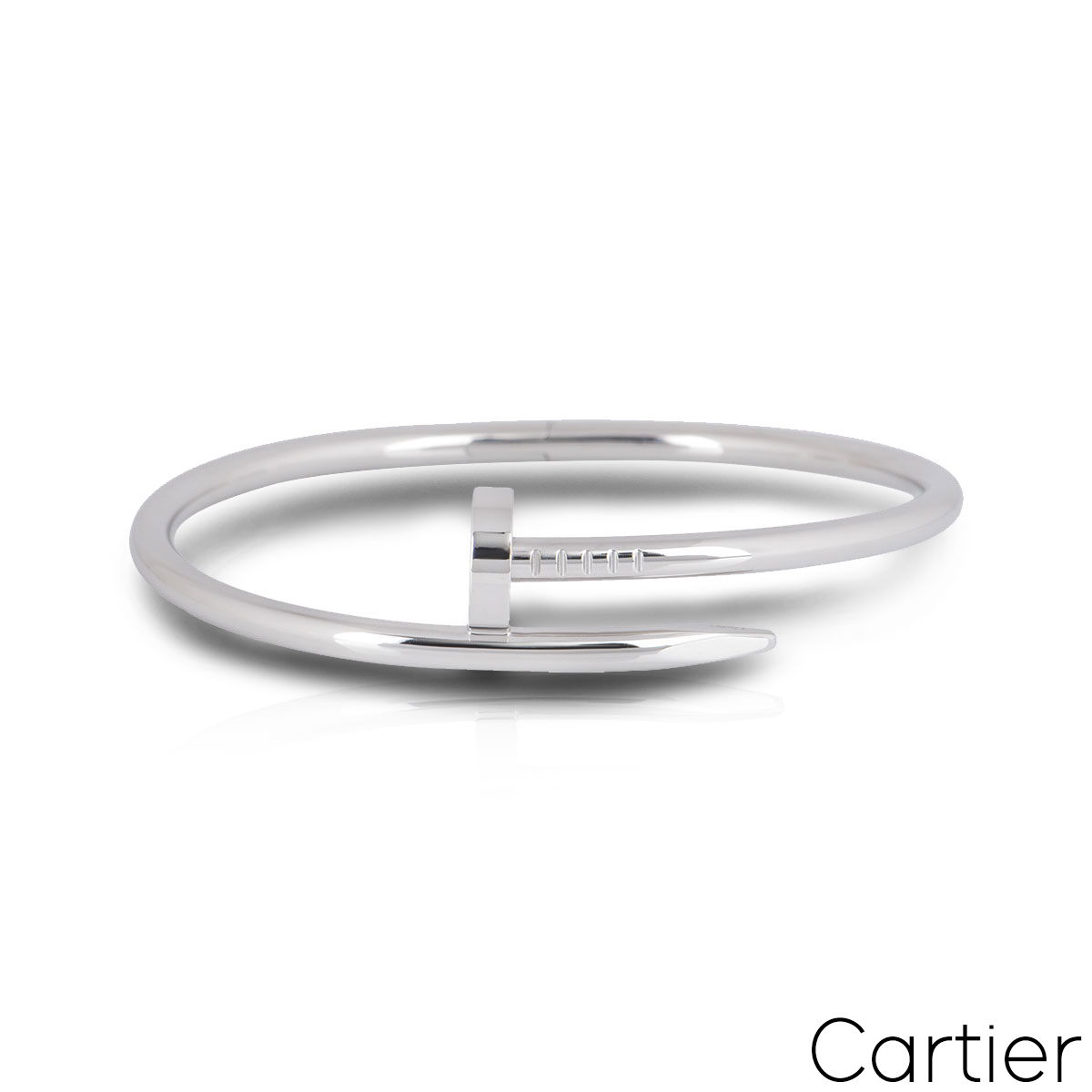 A exquiste 18k white gold Cartier bracelet from the Juste Un Clou collection. The bracelet is wrapped around with a nail head at one end and nail end at the other tip. The bracelet is size 17 with the new style clasp fitting and has a gross weight of 33.80 grams.