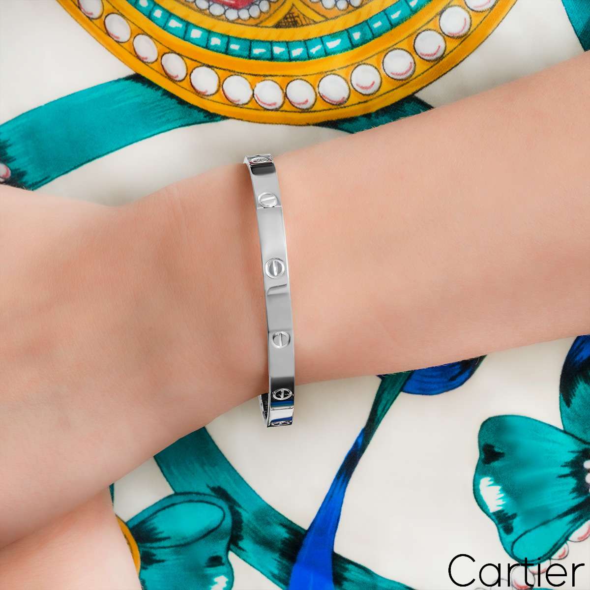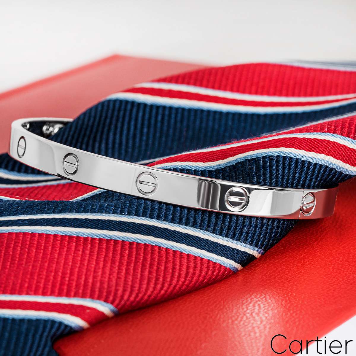 An 18k white gold Cartier bracelet from the Love collection. The bracelet comprises of the iconic screw motifs on the outer edge. The bracelet is a size 17 and features the new style screw fitting. The bracelet has a gross weight of 32.5 grams.