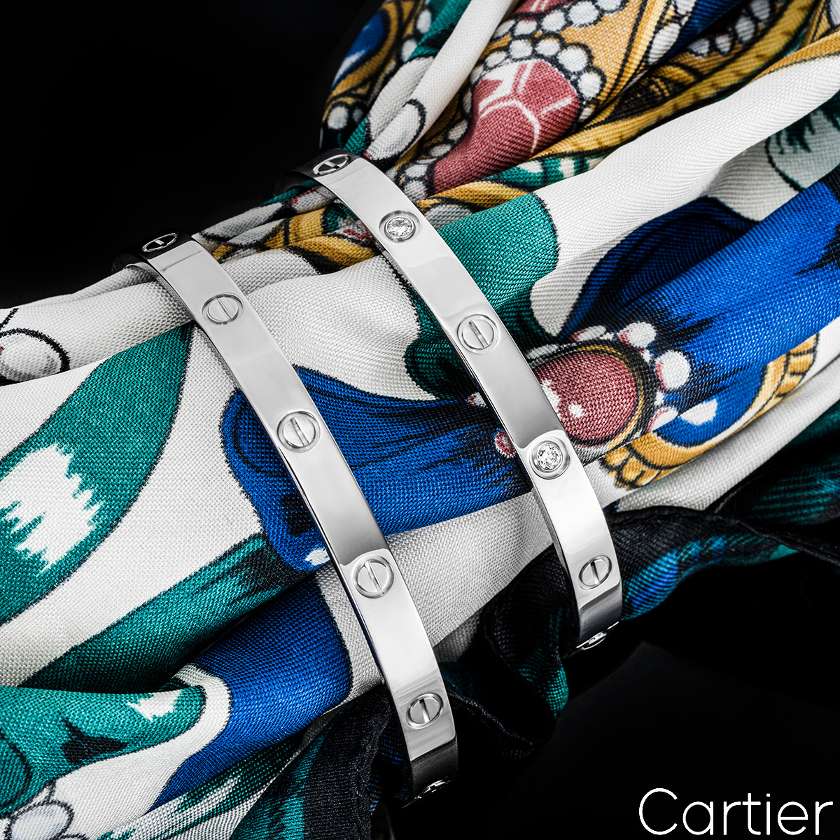 An 18k white gold Cartier bracelet from the Love collection. The bracelet comprises of the iconic screw motifs on the outer edge. The bracelet is a size 19 and features the new style screw fitting. The bracelet has a gross weight of 34.5 grams.