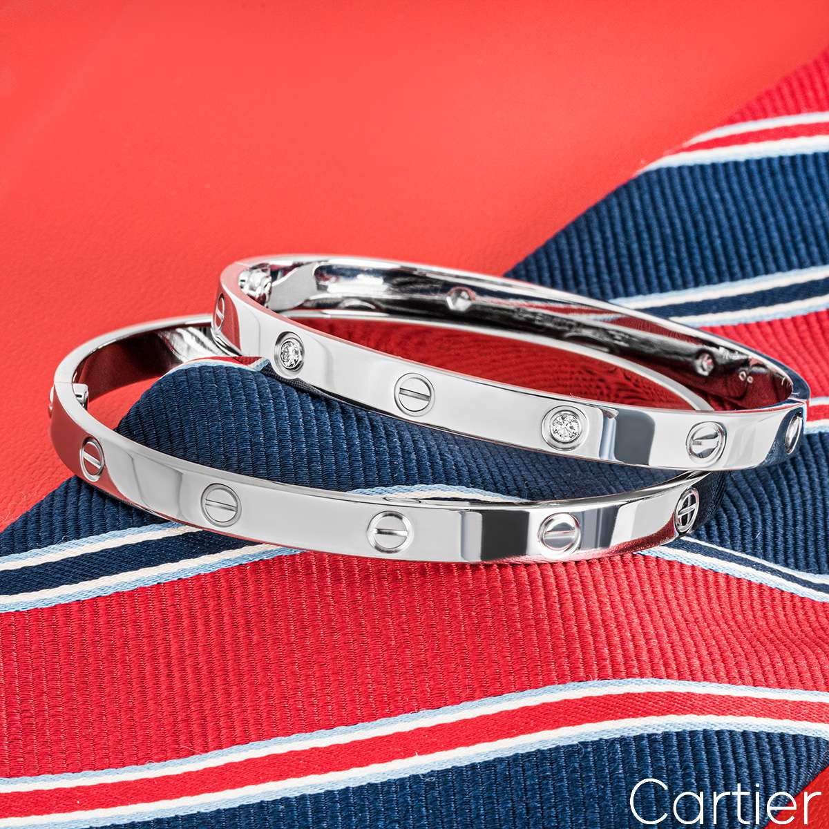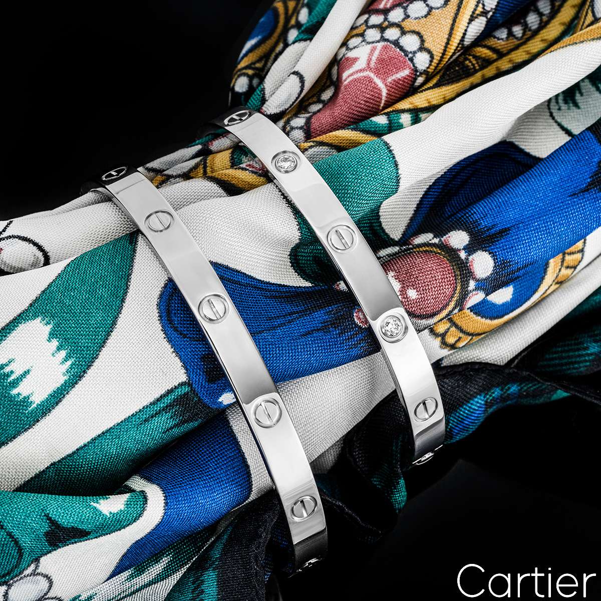 An 18k white gold Cartier bracelet from the Love collection. The bracelet comprises of the iconic Cartier screw motif design on the outer edge. A size 20, featuring the new style screw fitting, this bracelet has a gross weight of 36.2 grams.