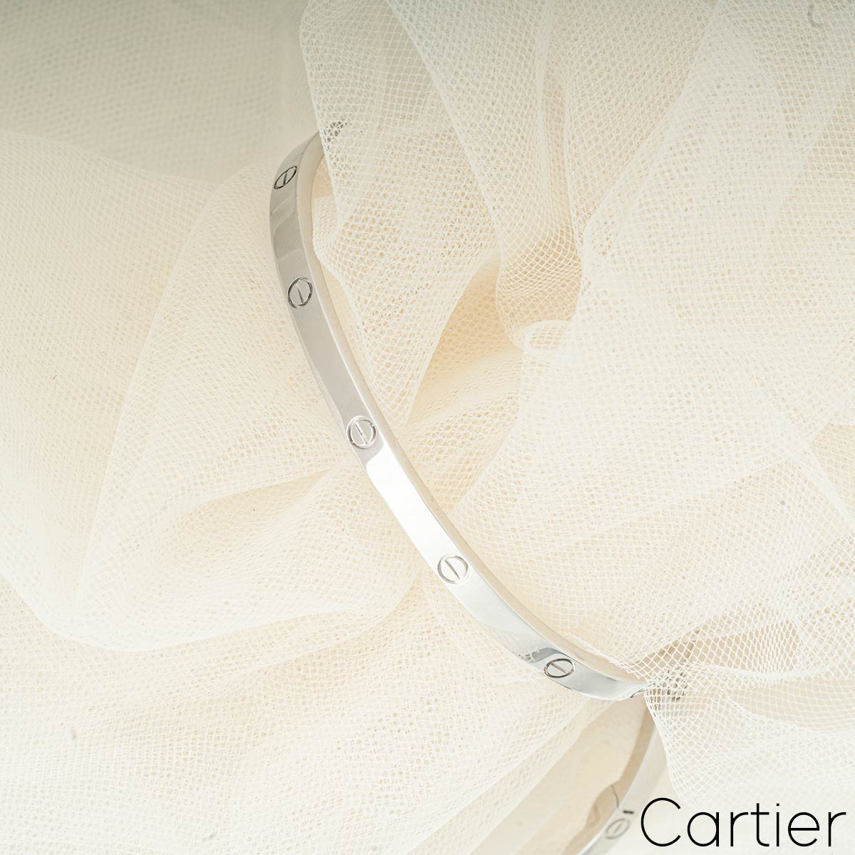 A timeless 18k white gold Cartier bracelet from the Love collection. The bracelet comprises of the iconic screw motif displayed around the outer edge and features a single screw and hinge fitting. This is the SM version of the love bracelet in a size 16 with a gross weight of 18.20 grams.