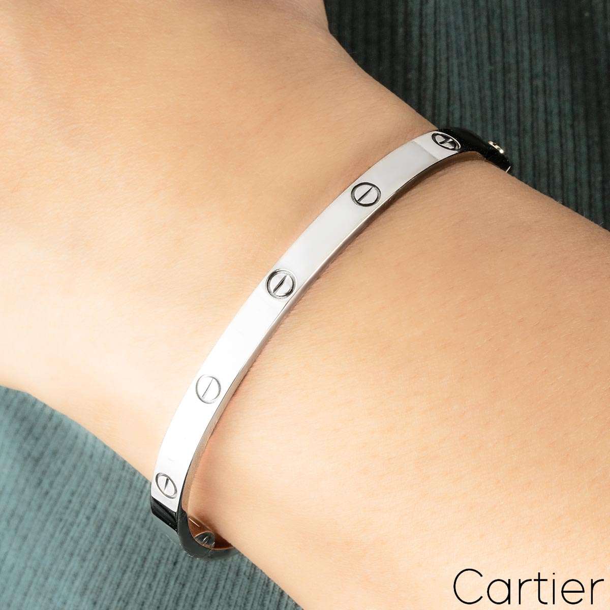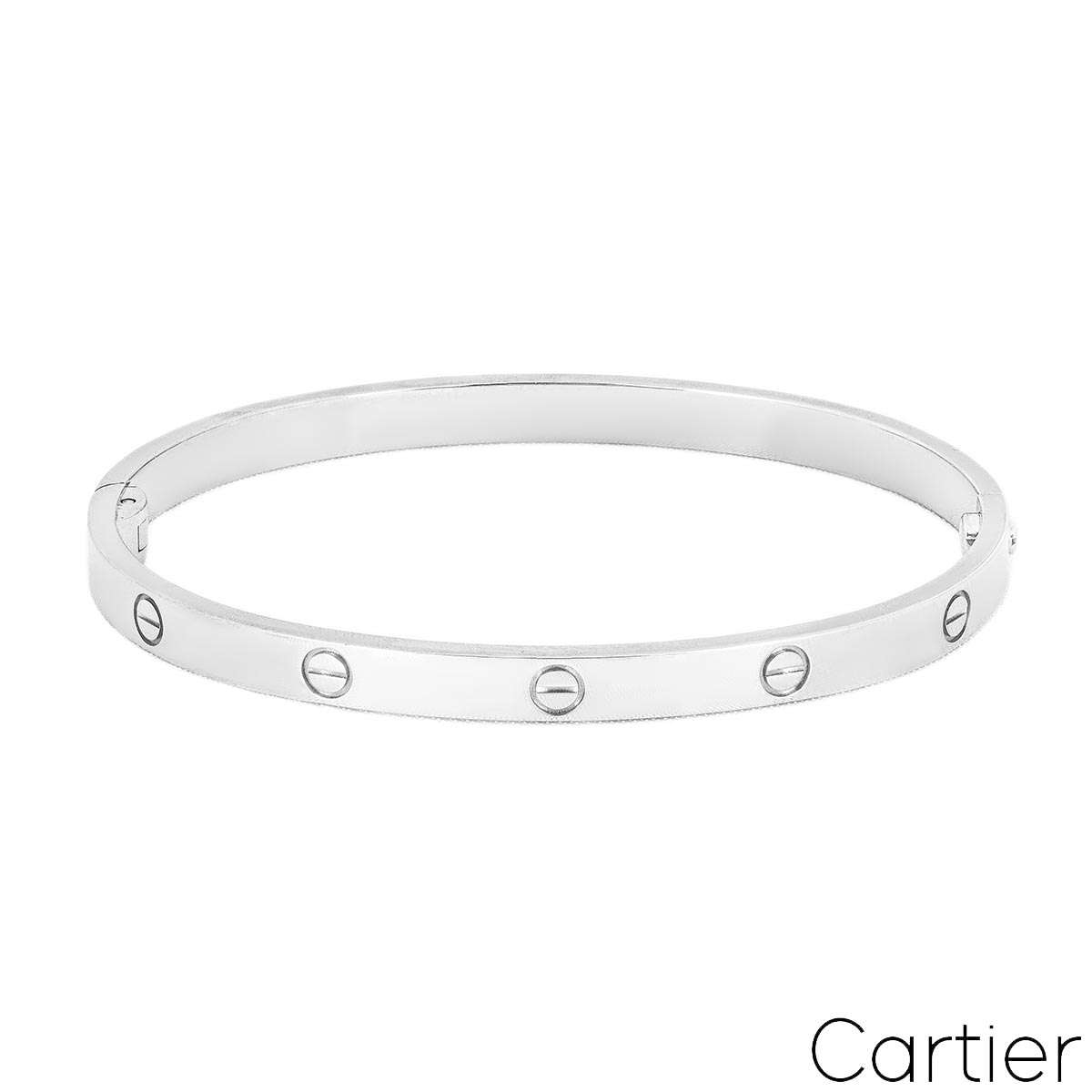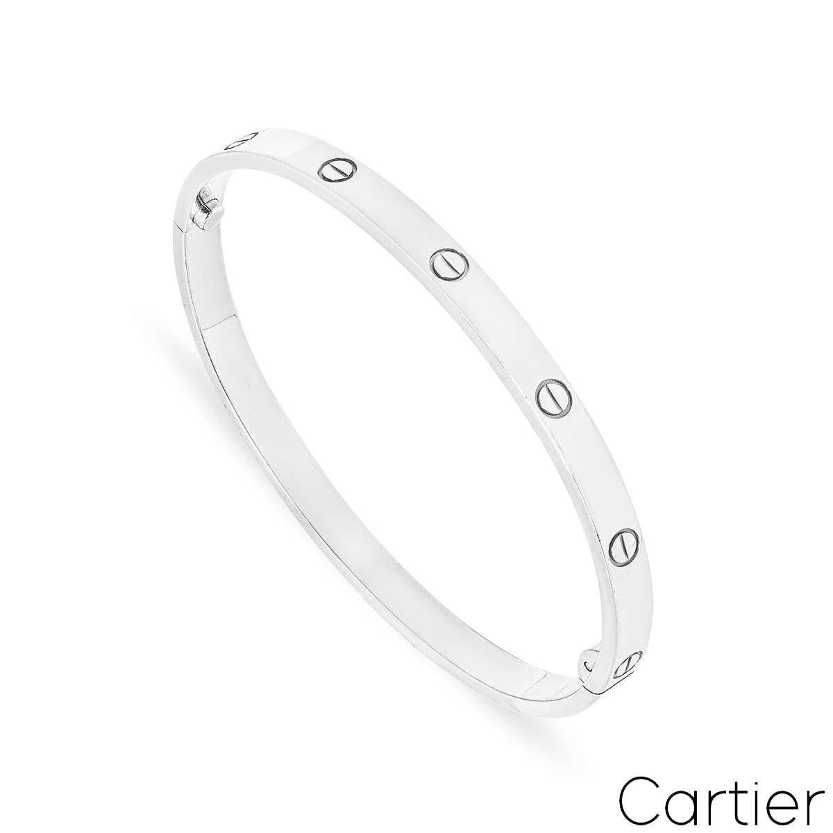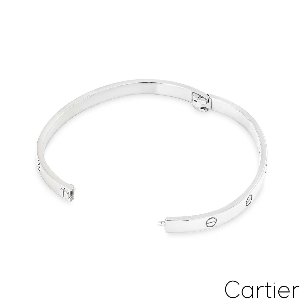 A timeless 18k white gold Cartier bracelet from the Love collection. This latest medium version of the classic Love bracelet features the iconic screw motifs and includes a single screw and hinge fitting. The bracelet is a size 18, measures 4.8mm in width and has a gross weight of 27.9 grams.