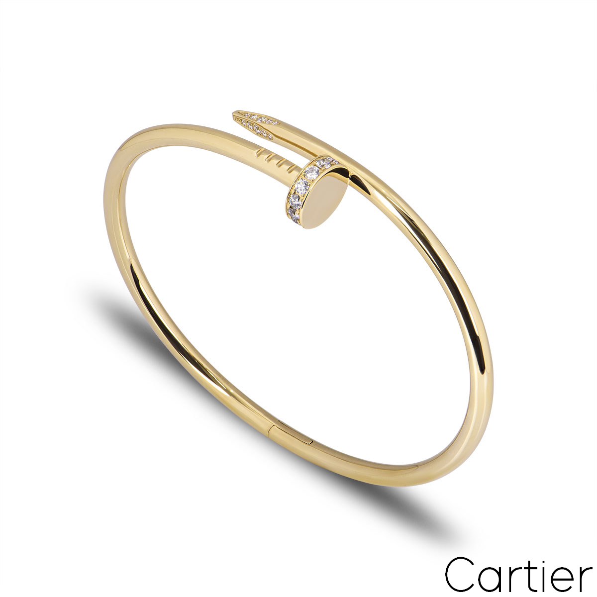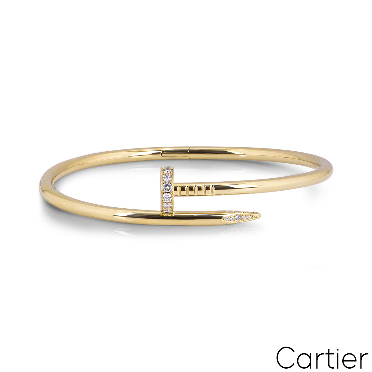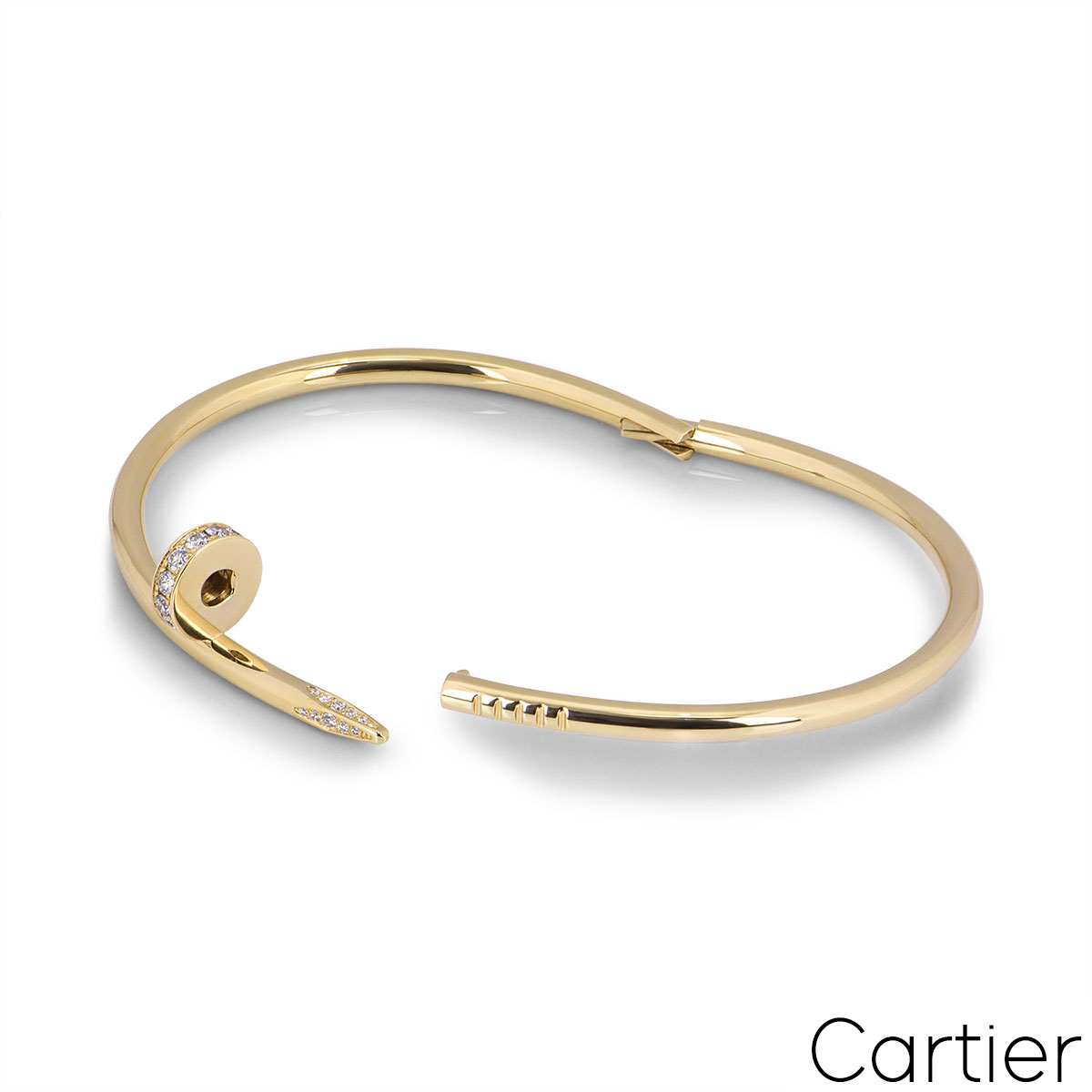 A stunning 18k yellow gold Cartier diamond bracelet from the Juste Un Clou collection. The bracelet is in the style of a nail and has 27 round brilliant cut pave diamonds set in the head and tip, totalling 0.54ct. The diamonds are predominantly F colour and VS clarity. The bangle is size 19 and features the new style clasp with a gross weight of 34.40 grams.