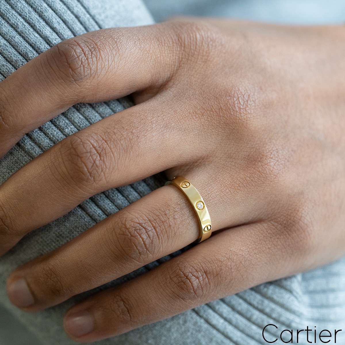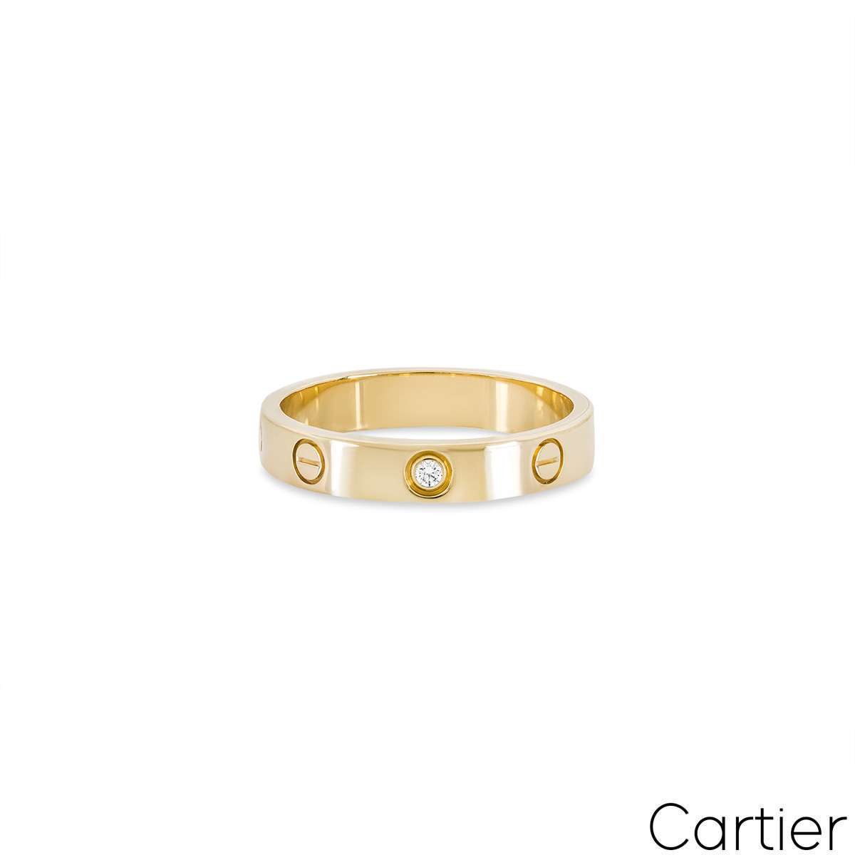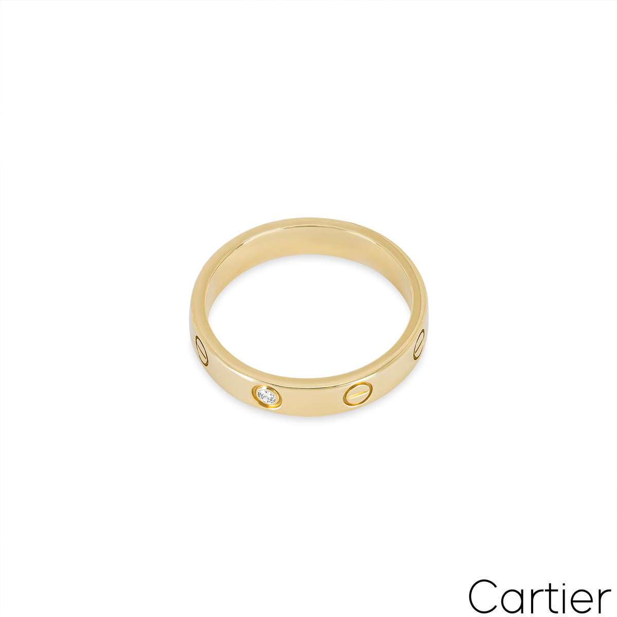 A Cartier diamond wedding band in yellow gold from the Love collection. Compromising of the iconic Cartier screw motif and a single round brilliant cut diamond, totalling 0.02ct. Measuring 4mm in width, the ring is a size 58 and has a gross weight of 4.84 grams.