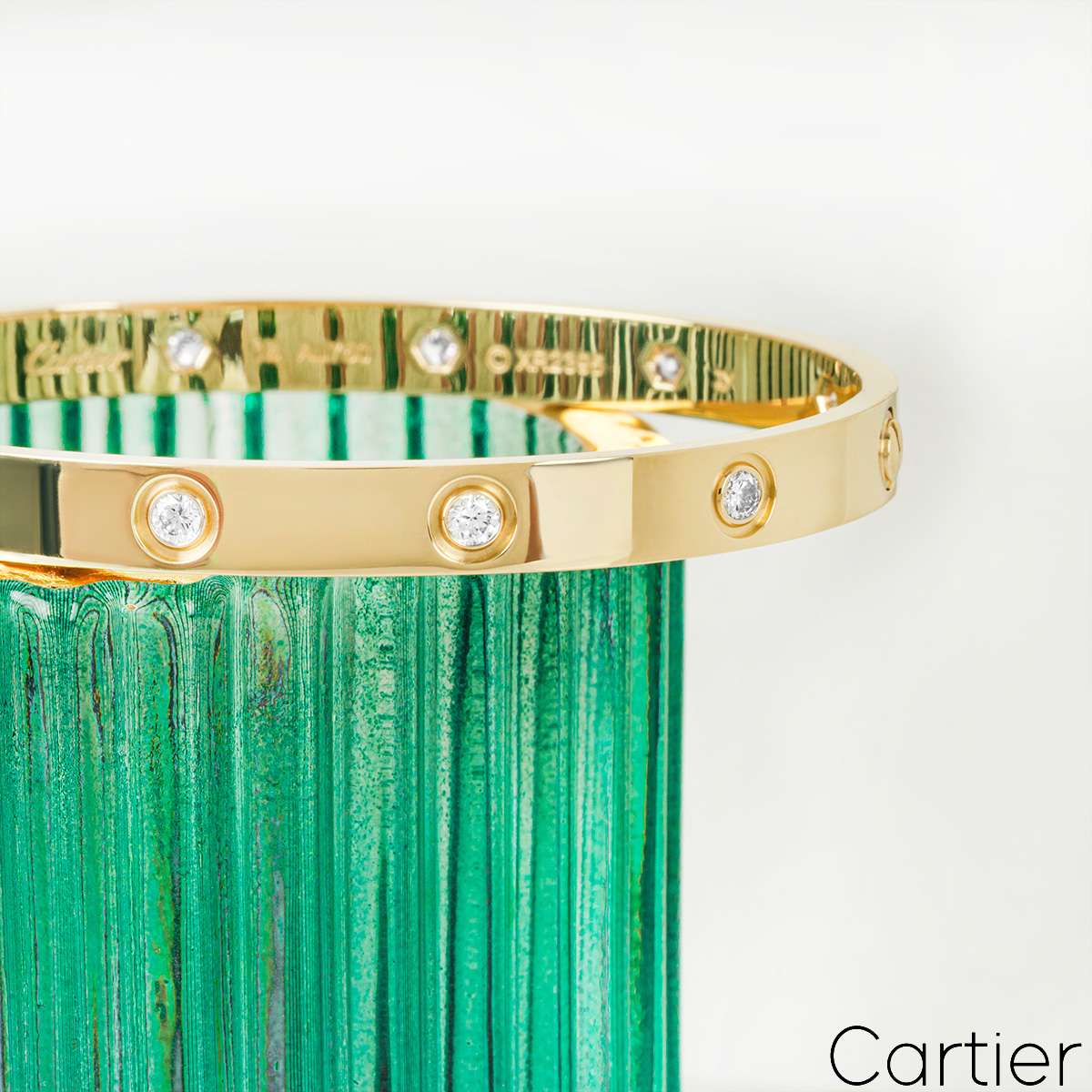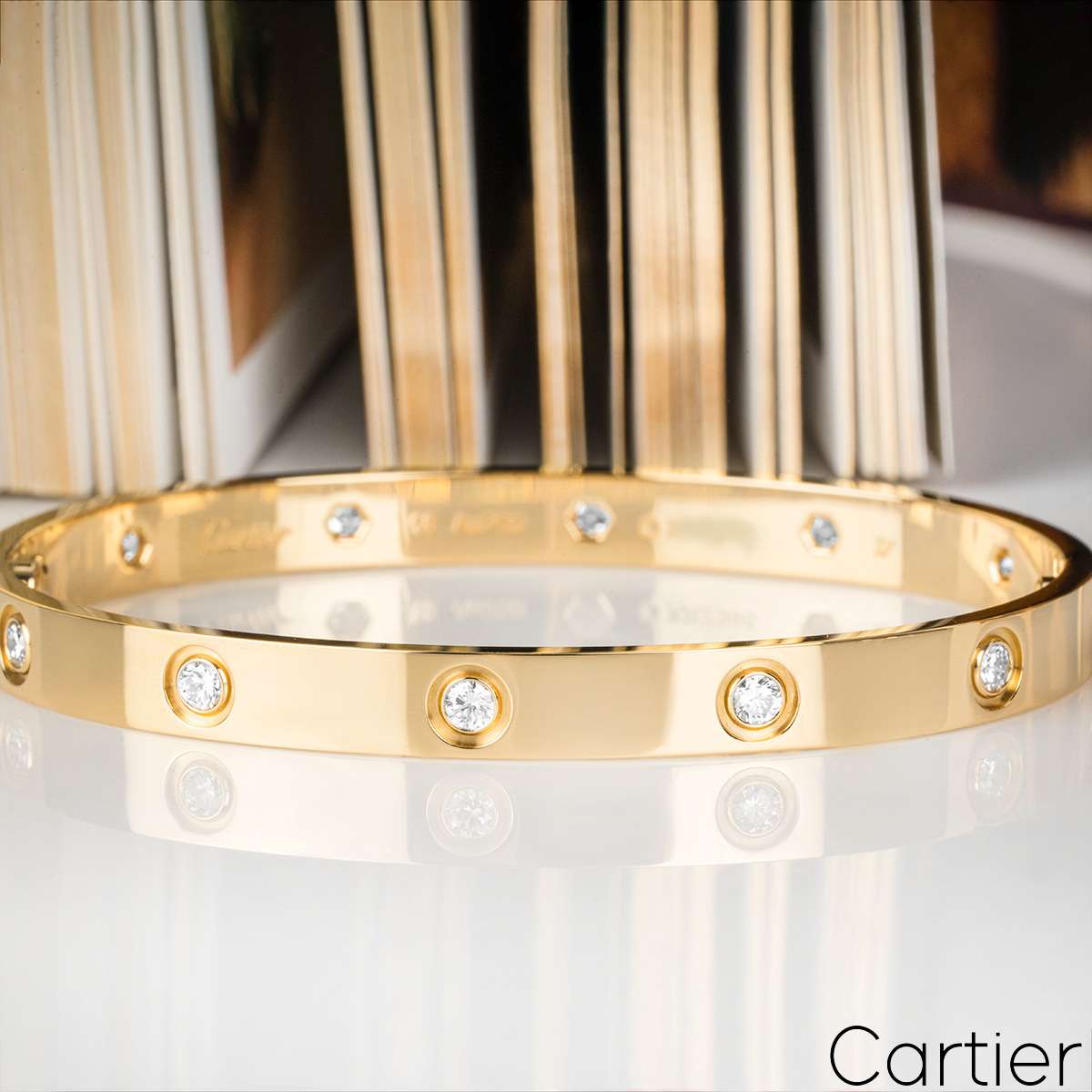 An iconic 18k yellow gold full diamond bracelet by Cartier from the Love collection. The bracelet is set with 10 round brilliant cut diamonds in a rubover setting circulating the outer edge throughout totalling 0.96ct. The bracelet is a size 17 and features the old style screw fitting and has a gross weight of 28.30 grams.