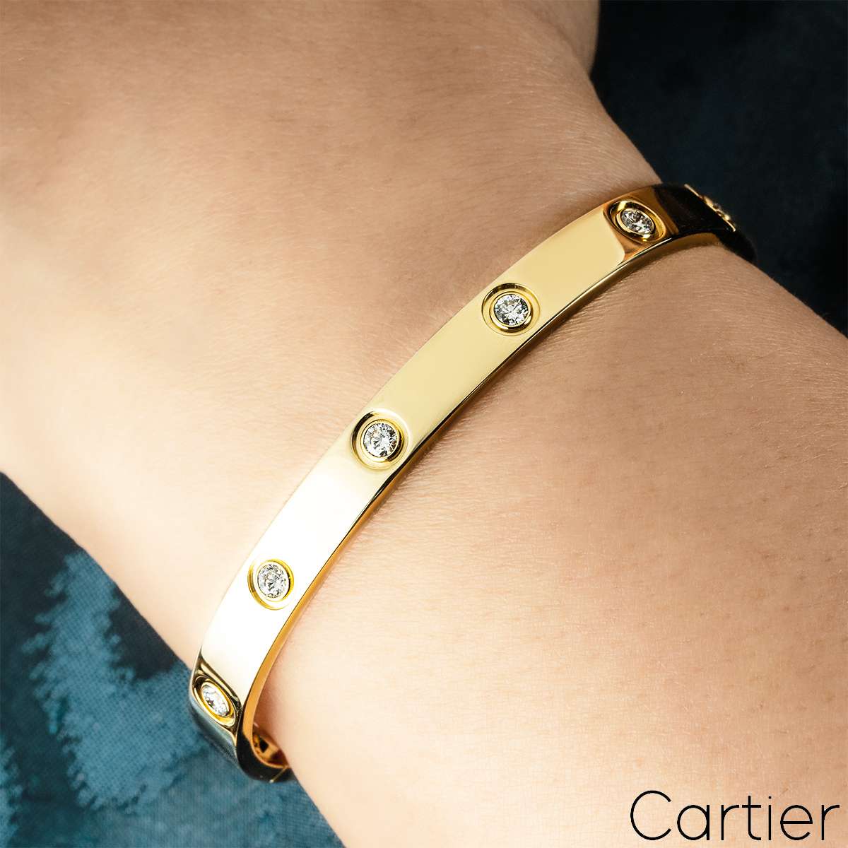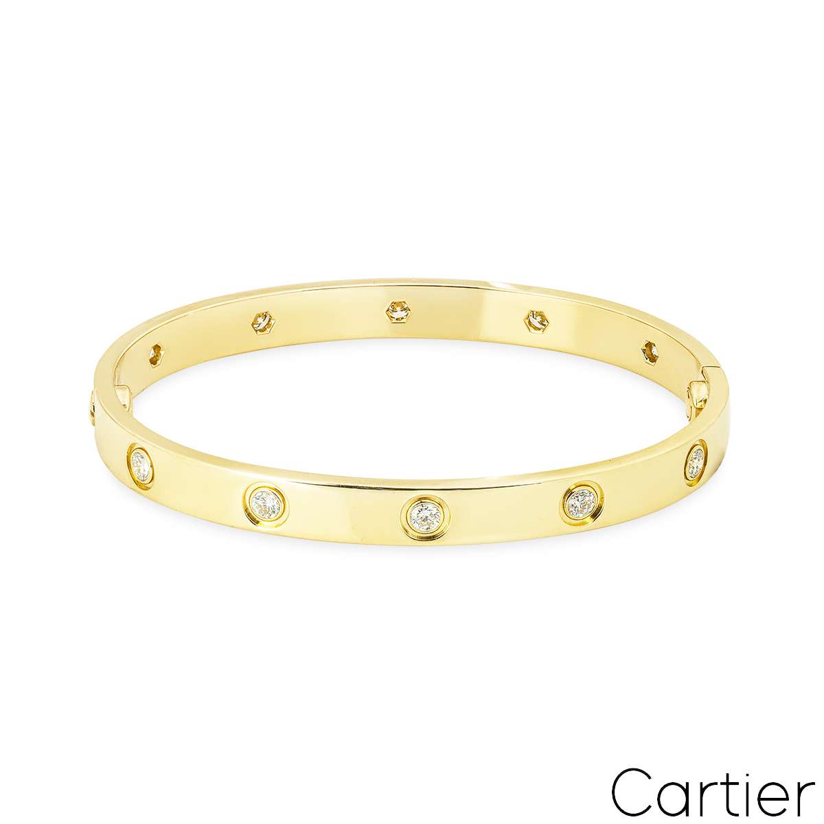 An iconic 18k yellow gold full diamond bracelet by Cartier from the Love collection. The bracelet is set with 10 round brilliant cut diamonds in a bezel setting surrounding the outer edge, totalling 0.96ct. The bracelet is a size 17 and features the service replacement screw system and has a gross weight of 31.4 grams.