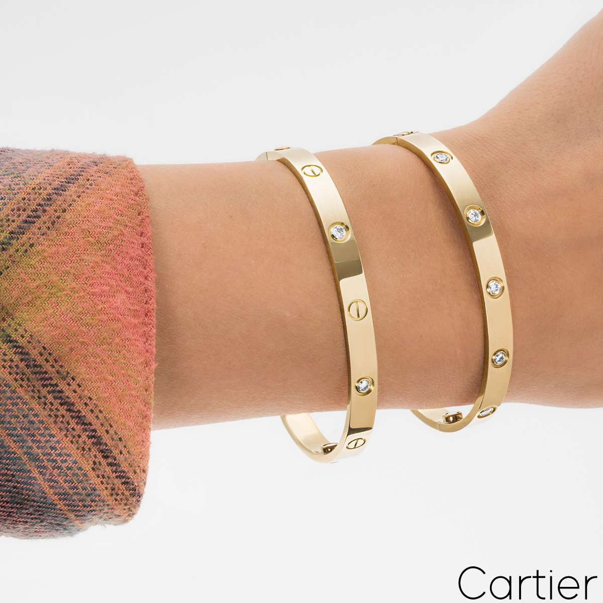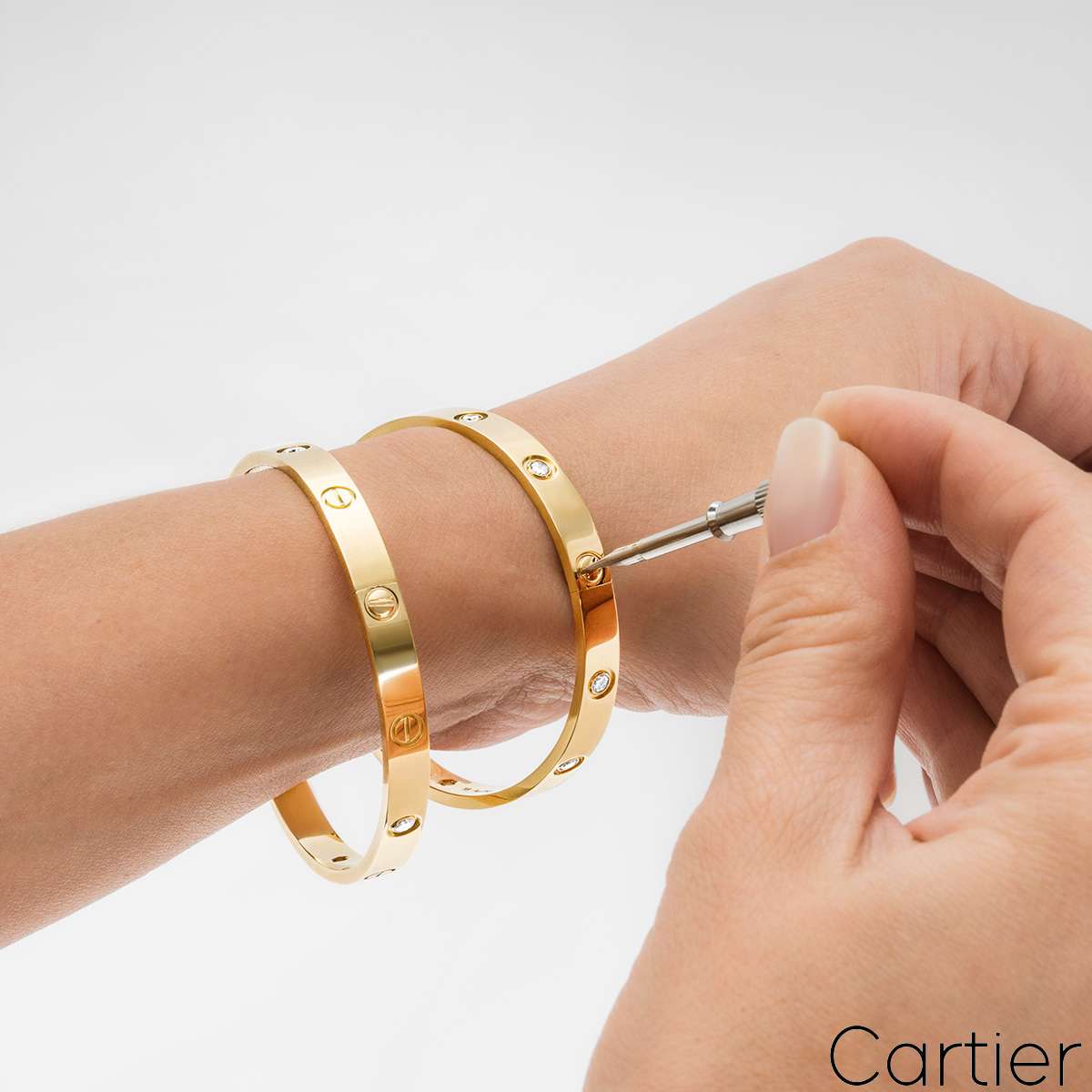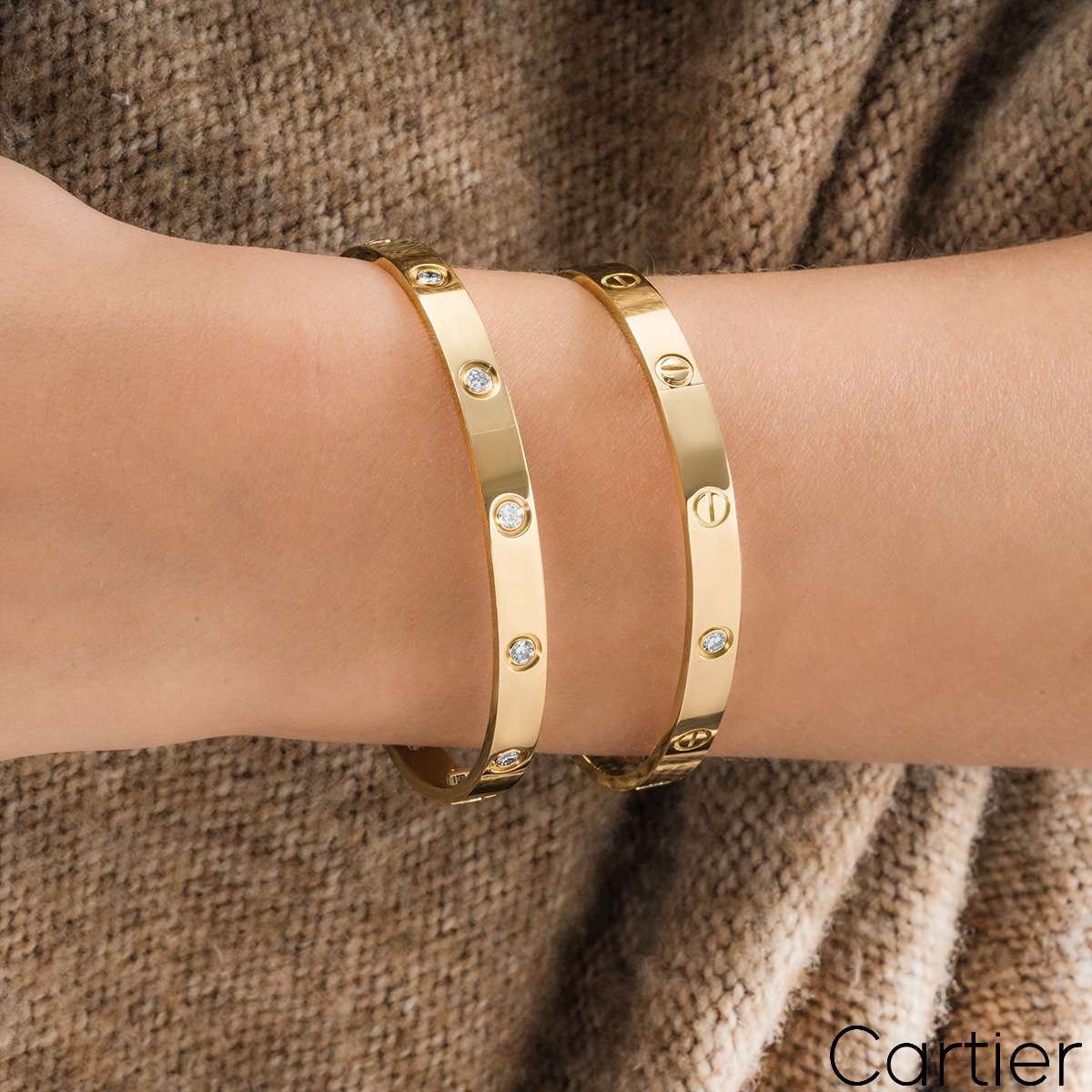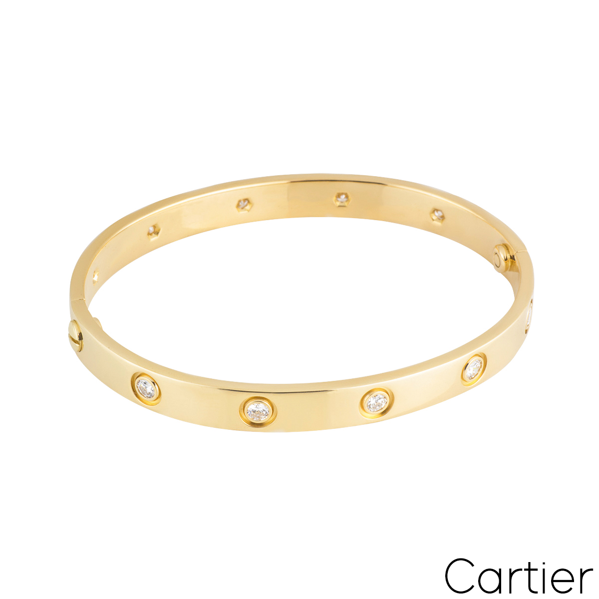 An iconic 18k yellow gold full diamond bracelet by Cartier from the Love collection. The bracelet is set with 10 round brilliant cut diamonds in a rubover setting circulating the outer edge throughout totalling 0.96ct. The bracelet is a size 19 and features the old style screw fitting and has a gross weight of 32.60 grams.