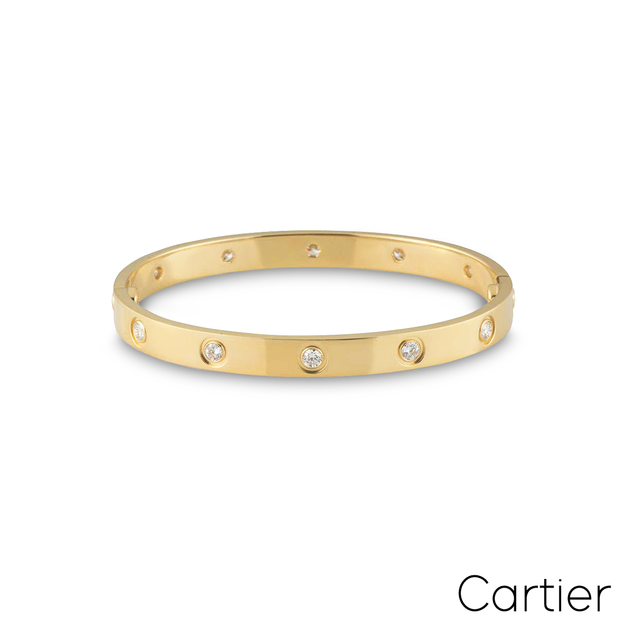 An iconic 18k yellow gold full diamond Love bracelet from the Love collection. The bracelet comprises of 10 round brilliant cut diamonds circulating the outer edge with a total weight of 0.96ct. The bracelet is a size 20 and features the new style screw fitting, with a gross weight of 36.5 grams.