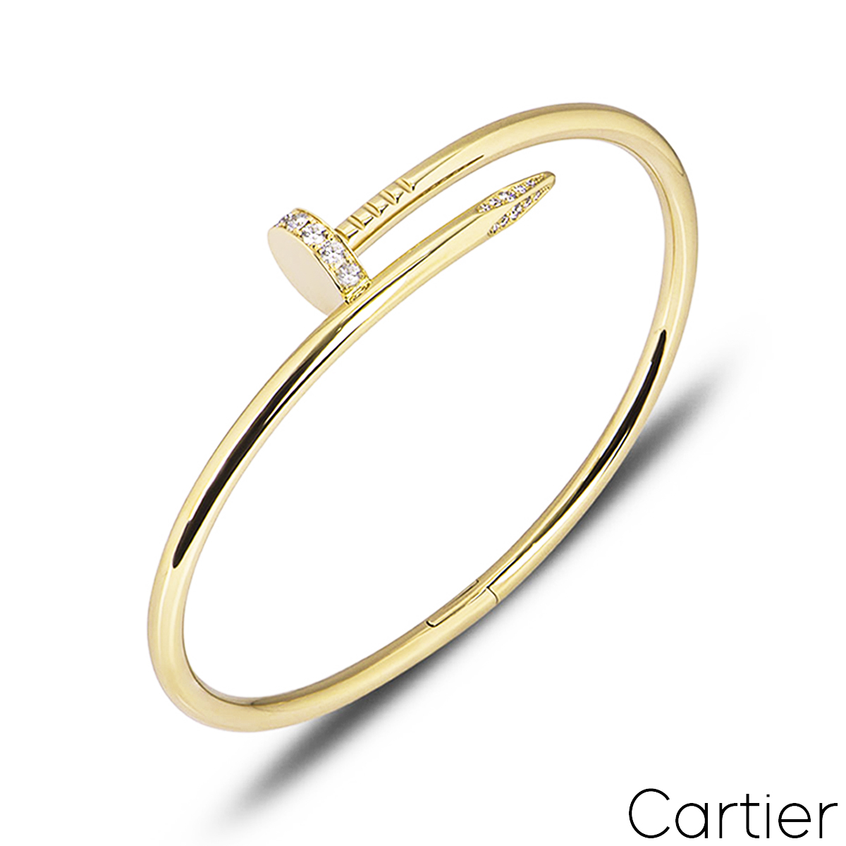 An 18k yellow gold Cartier bracelet from the Love collection. The bracelet comprises 10 round brilliant cut diamonds circulating the outer edge with a total weight 0.21ct and features a single screw and hinge fitting. This is the SM version of the love bracelet. The bracelet is a size 16 with a gross weight of 17.90 grams.
