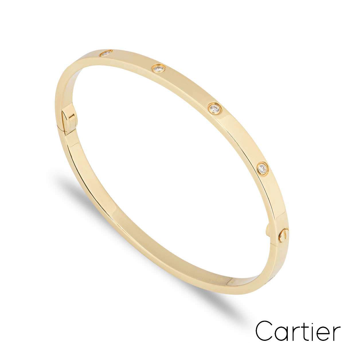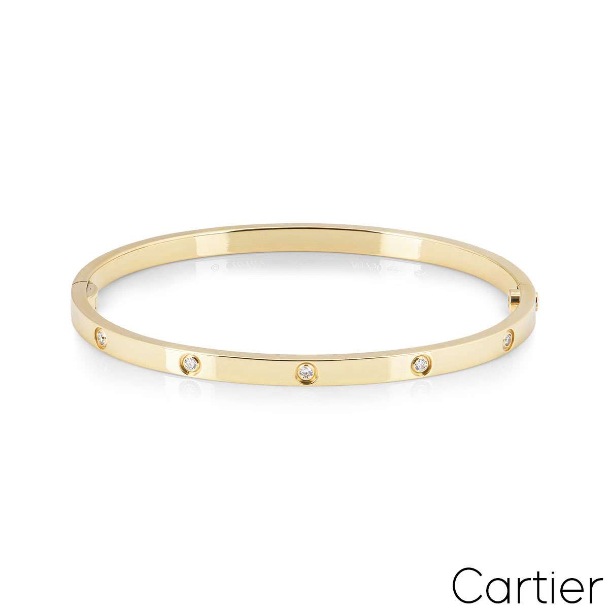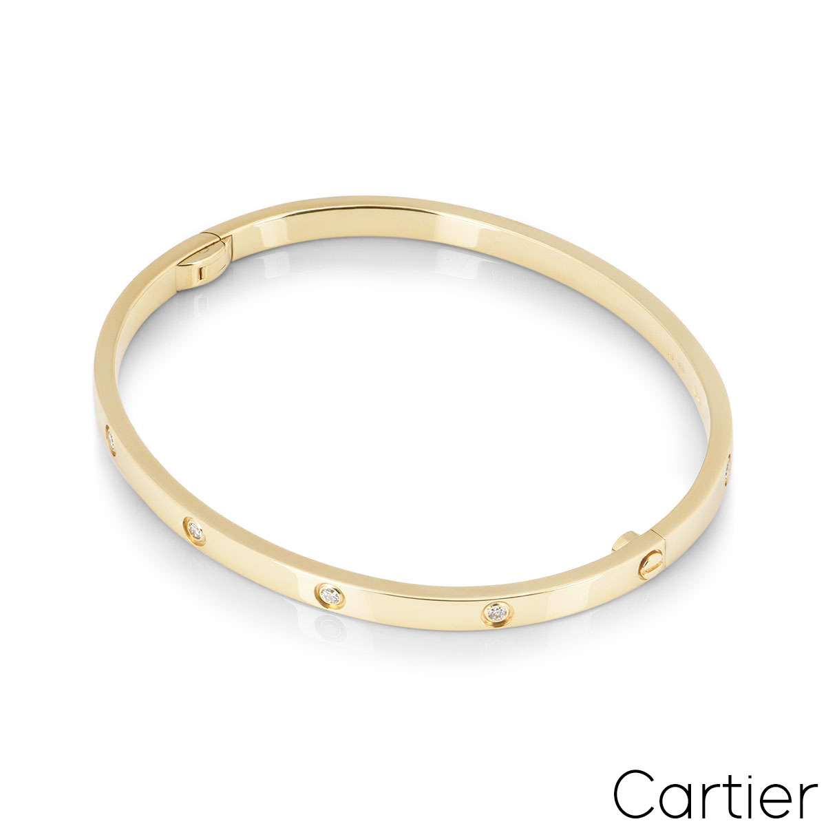 An 18k yellow gold Cartier bracelet from the Love collection. The bracelet comprises 10 round brilliant cut diamonds circulating the outer edge with a total weight 0.21ct and features a single screw and hinge fitting. This is the SM version of the love bracelet. The bracelet is a size 17 with a gross weight of 18.20 grams.