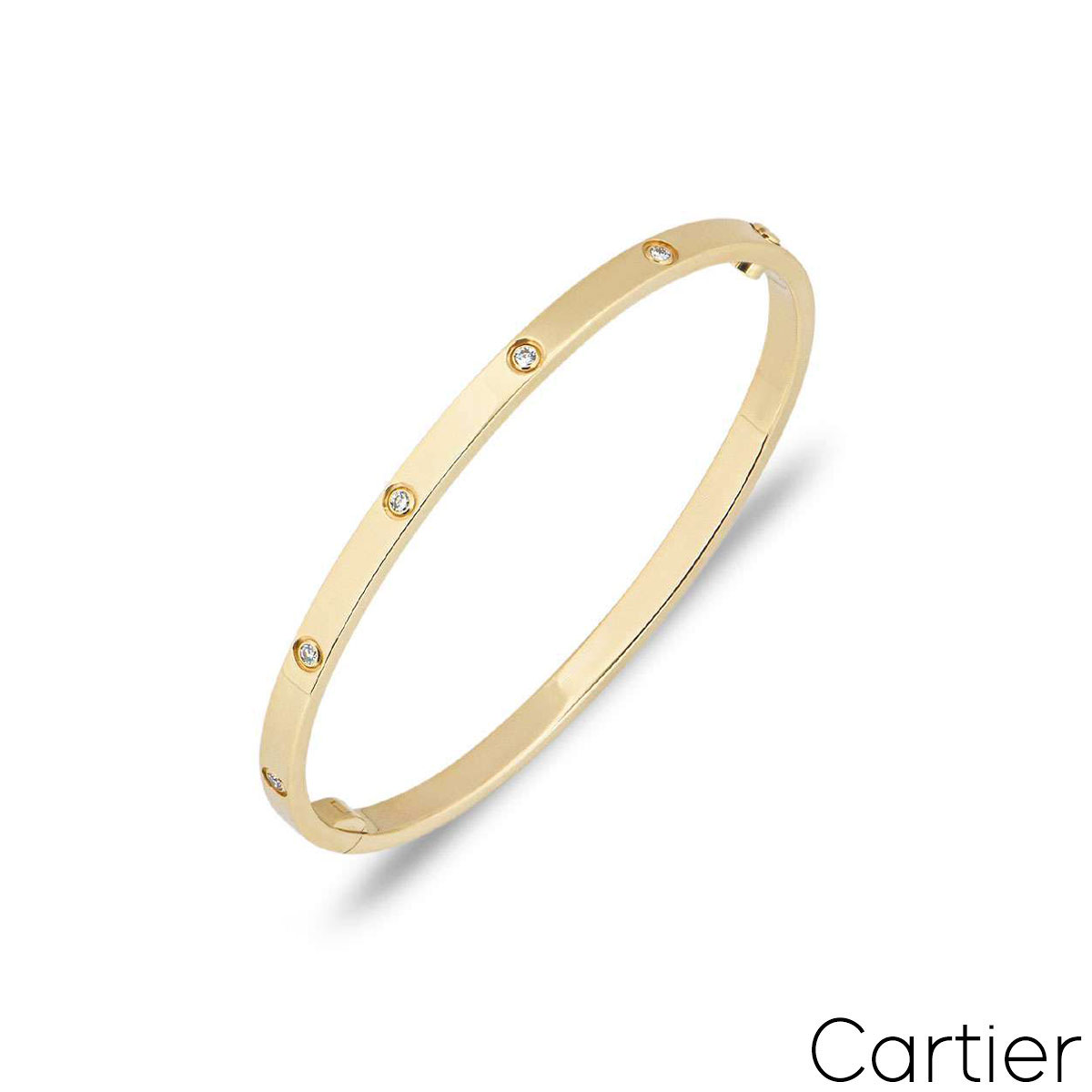 An 18k yellow gold Cartier half diamond bracelet from the Love collection. The bracelet comprises of screw motifs alternating with four round brilliant cut diamonds in a rubover setting on the outer edge of the bracelet with a weight of 0.42ct. The bracelet is a size 16 and features the new style screw system with a gross weight of 29.50 grams.