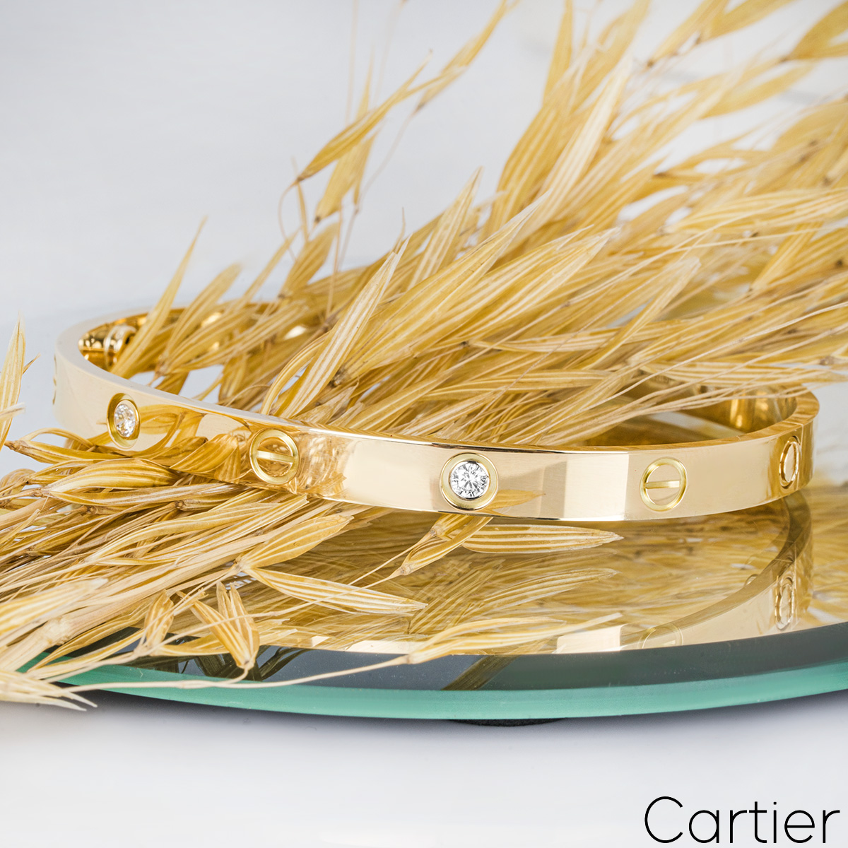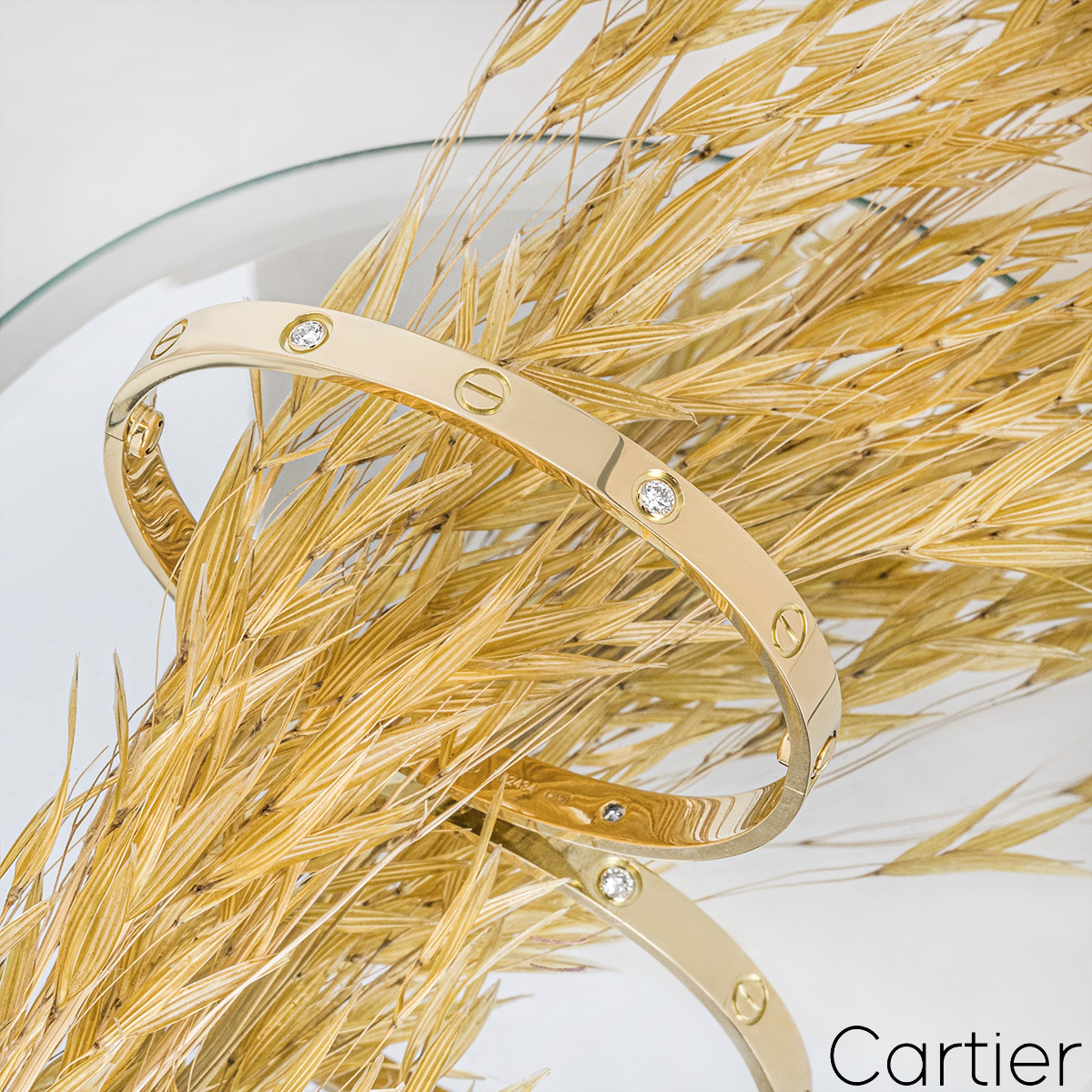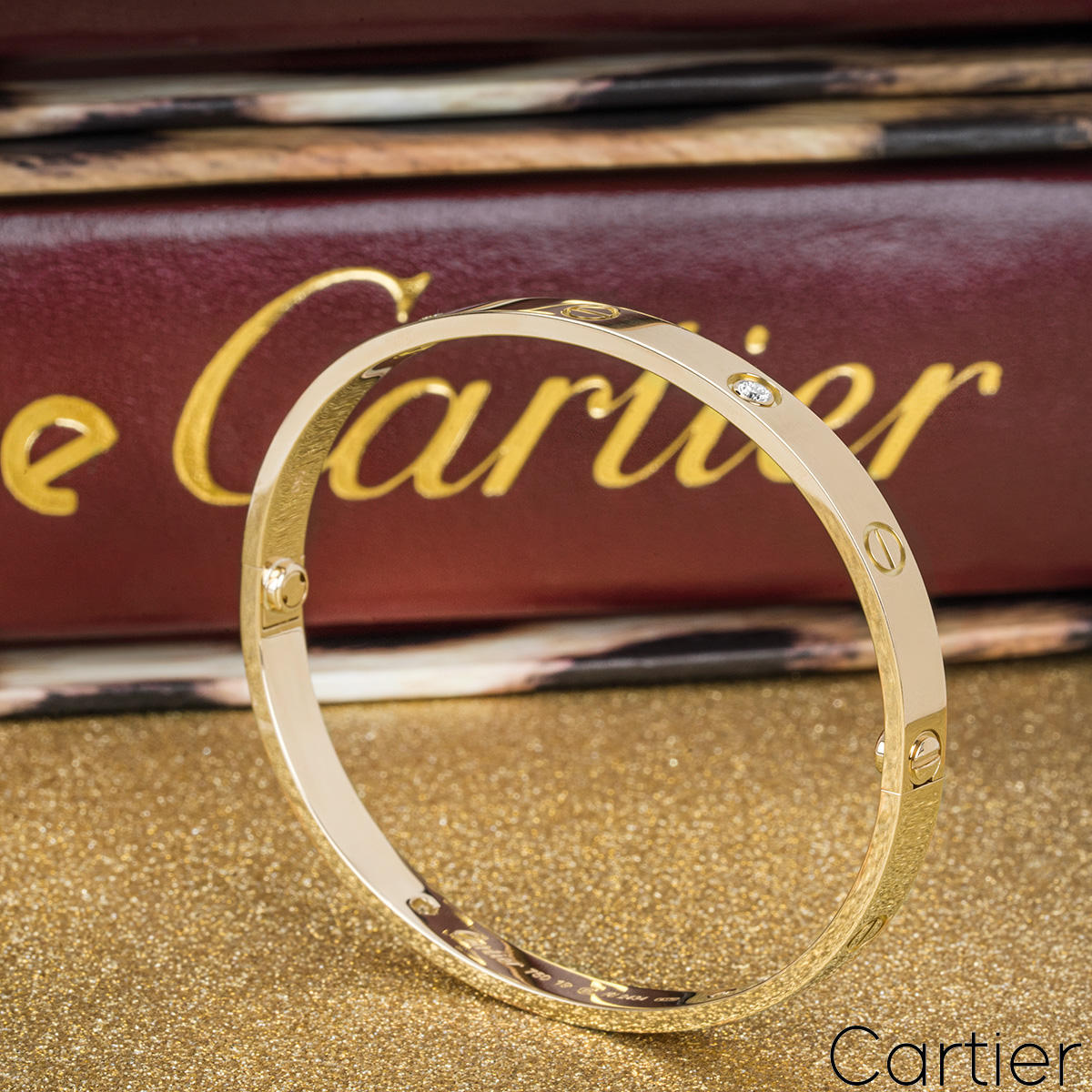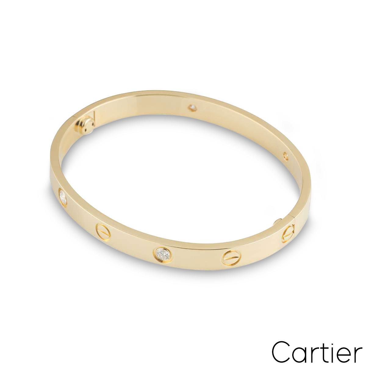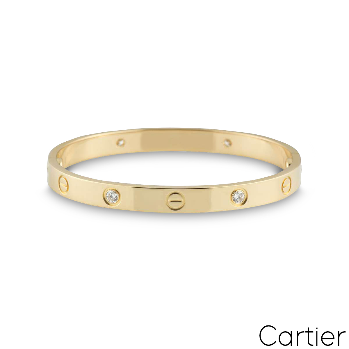 An 18k yellow gold Cartier half diamond bracelet from the Love collection. The bracelet comprises of screw motifs alternating with four round brilliant cut diamonds in a rubover setting on the outer edge of the bracelet with a weight of 0.42ct. The bracelet is a size 18 and features the new style screw system with a gross weight of 32.90 grams.