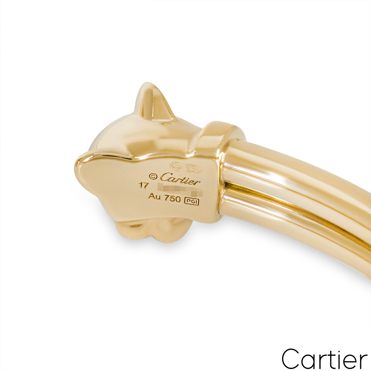 A lovely 18k yellow gold cuff bracelet by Cartier from the Panthère de Cartier collection. The cuff comprises of two panther head motifs opposite each other set with tsavorite eyes and an onyx nose. The bracelet fits a wrist size of up to 17cm and has a gross weight of 26.16 grams.
