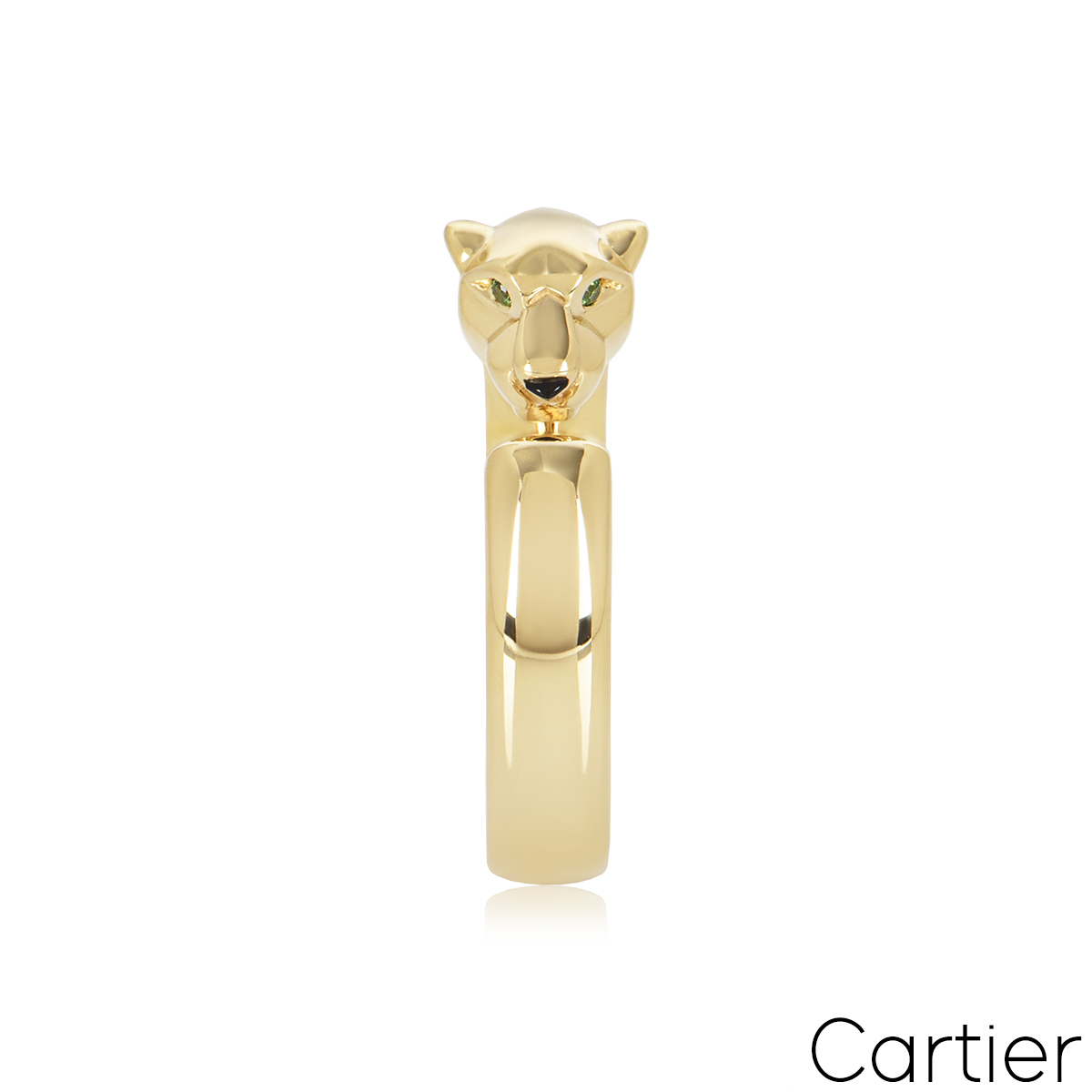 A striking 18k yellow gold ring by Cartier from the Panthere de Cartier collection. The ring comprises of a panther head motif set with 2 round tsavorites as eyes and an onyx nose. The ring is a size N½ and has a gross weight of 11.05 grams.