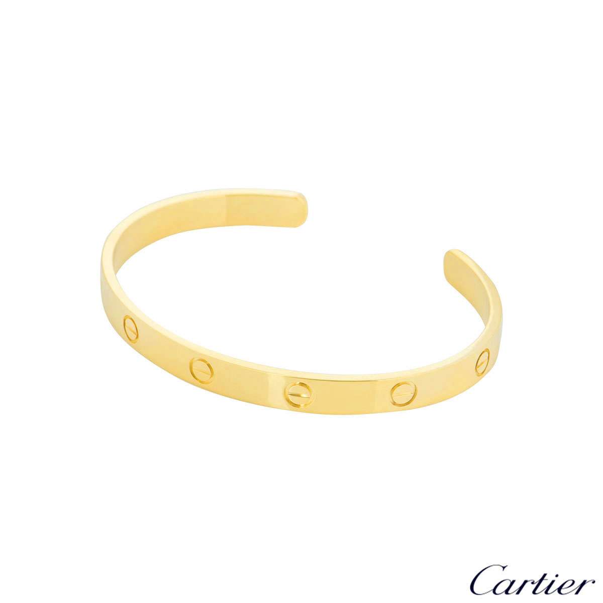 An iconic 18k yellow gold Cartier bracelet from the Love collection. The bracelet comes in a cuff style and features the traditional screw motif design which is displayed around the outer edge of the bracelet. The bracelet is a size 19 and has a gross weight of 25.7 grams.