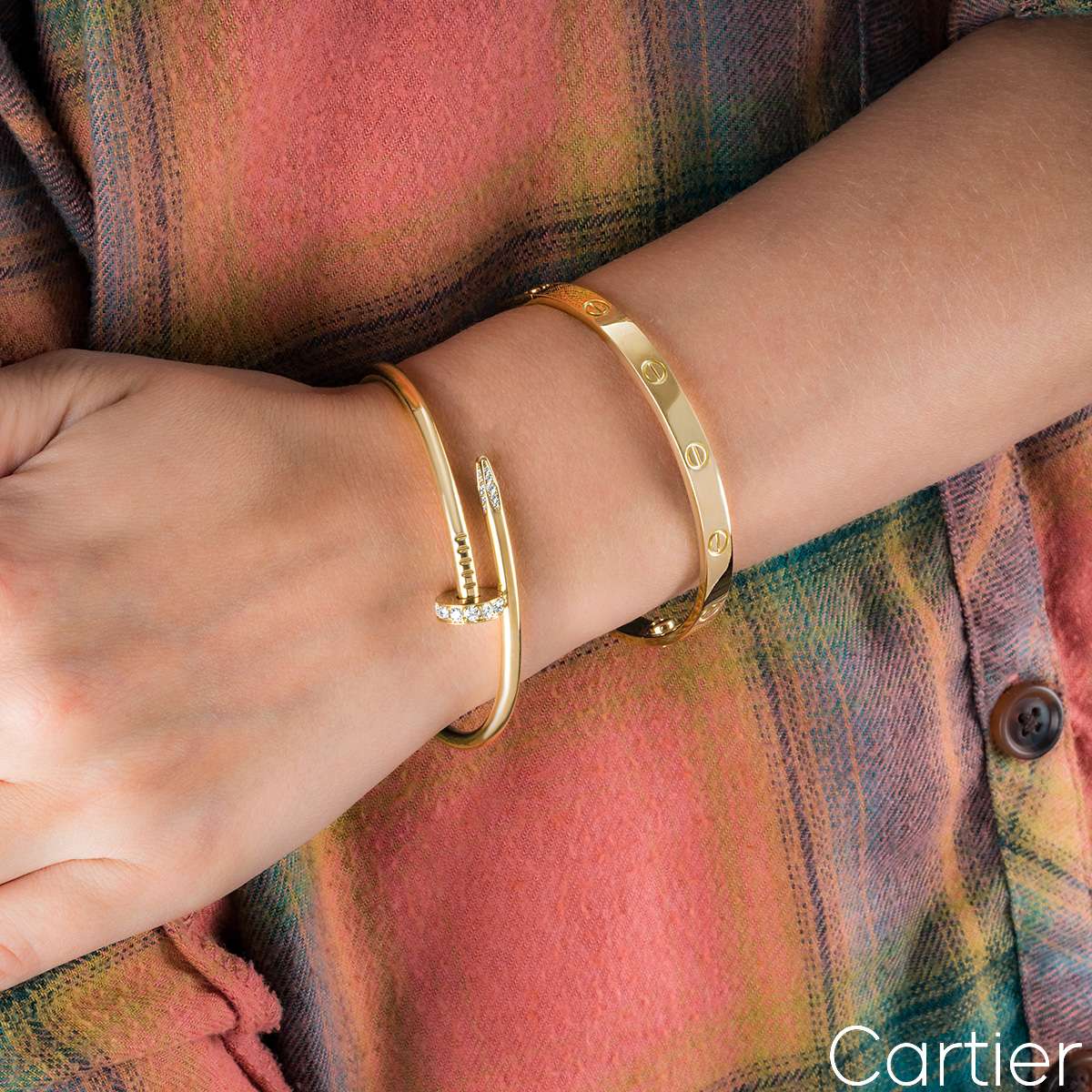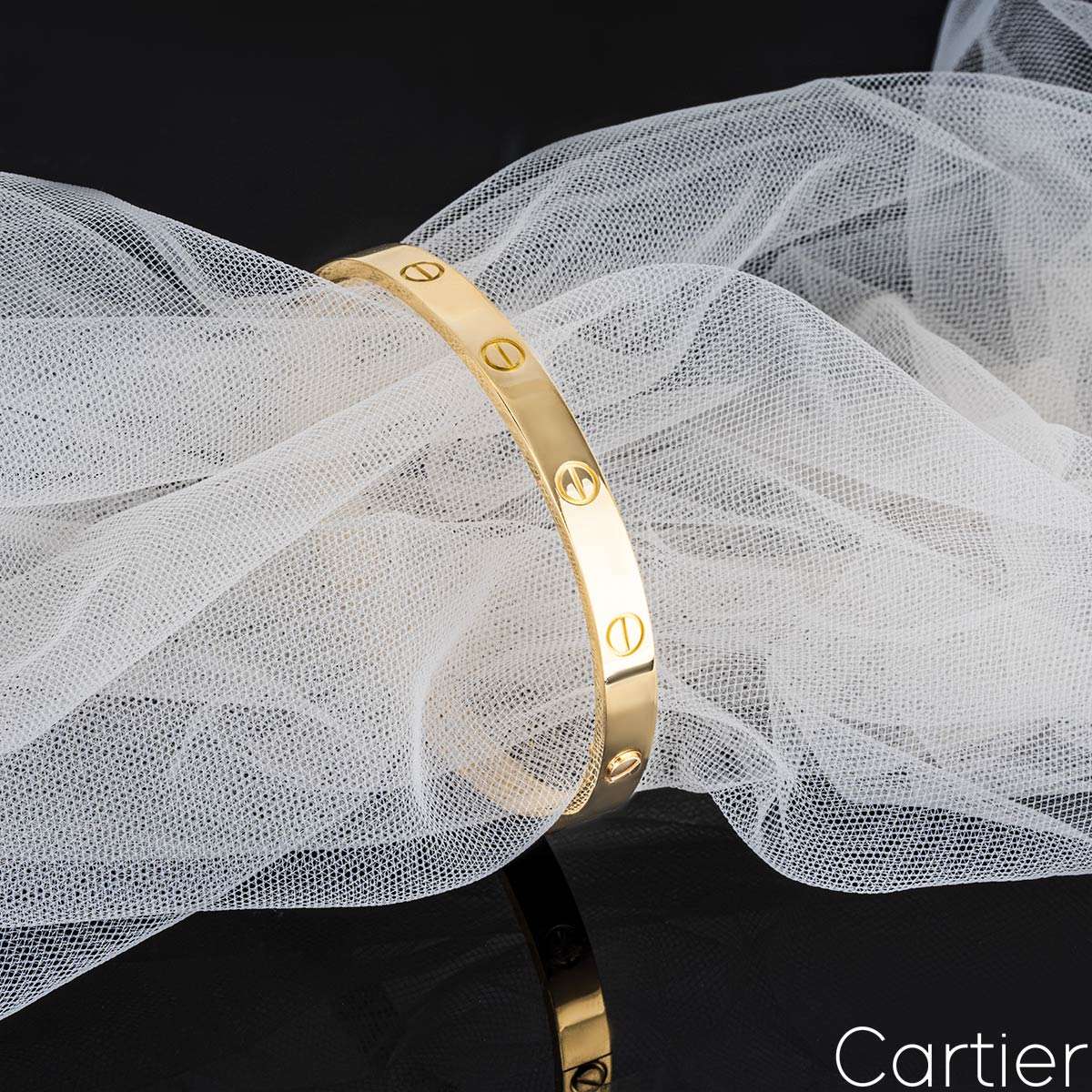 An 18k yellow gold Cartier bracelet from the Love collection. The bracelet has the screw motif displayed around the outer edge and features the new style screw fitting. This bracelet is a size 17 and has a gross weight 30.80 grams.