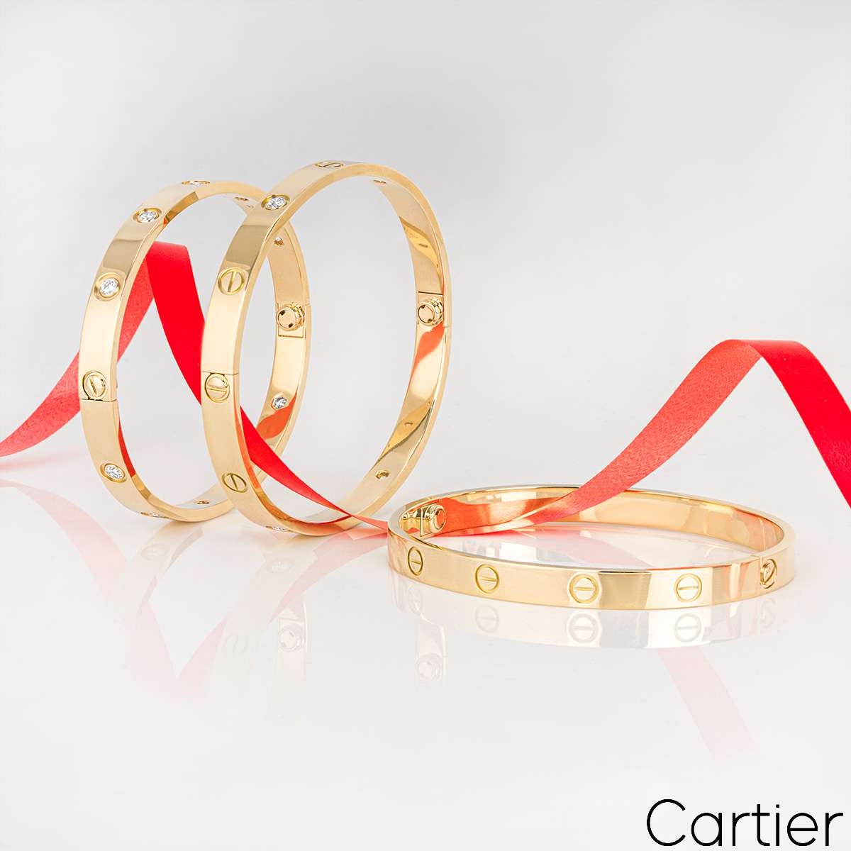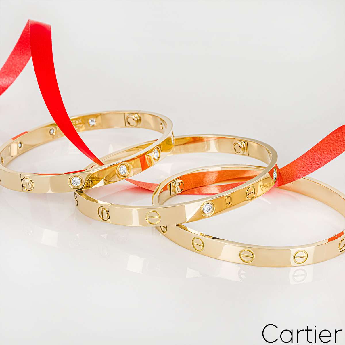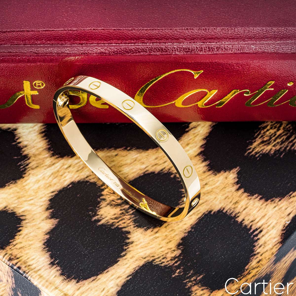 An 18k yellow gold Cartier bracelet from the Love collection. The bracelet has the screw motif displayed around the outer edge and features the new style screw fitting. This bracelet is a size 18 and has a gross weight 33.60 grams.