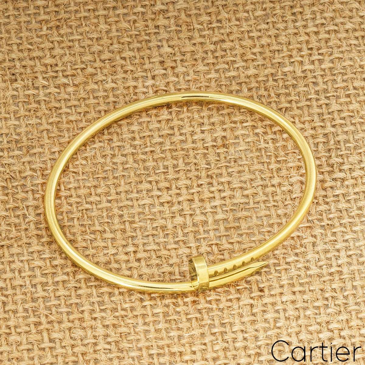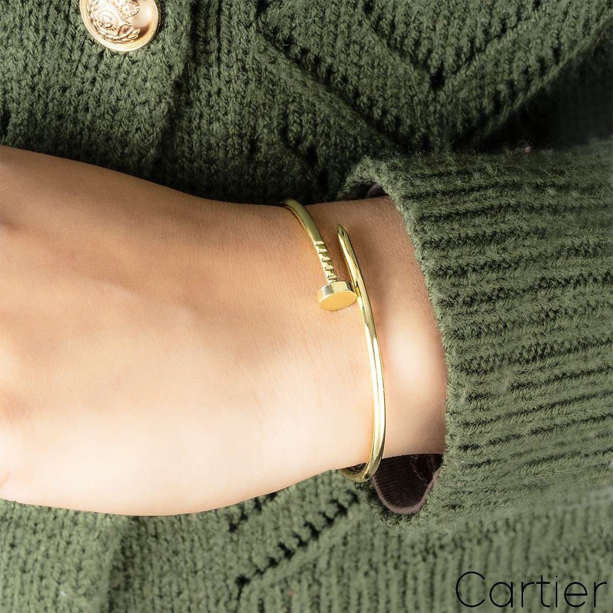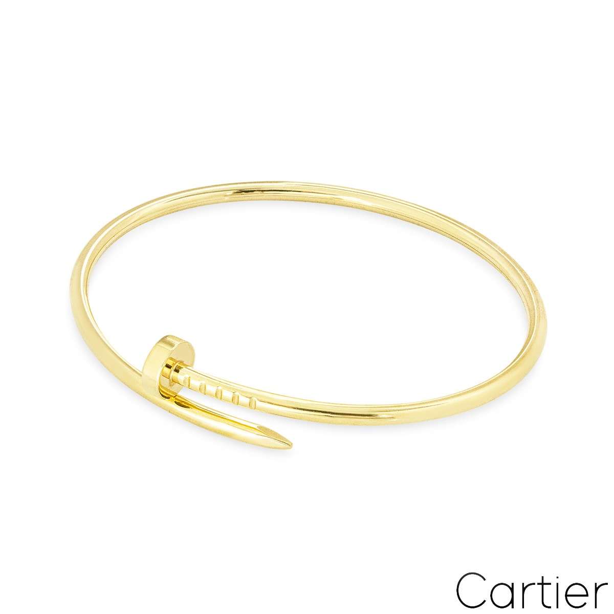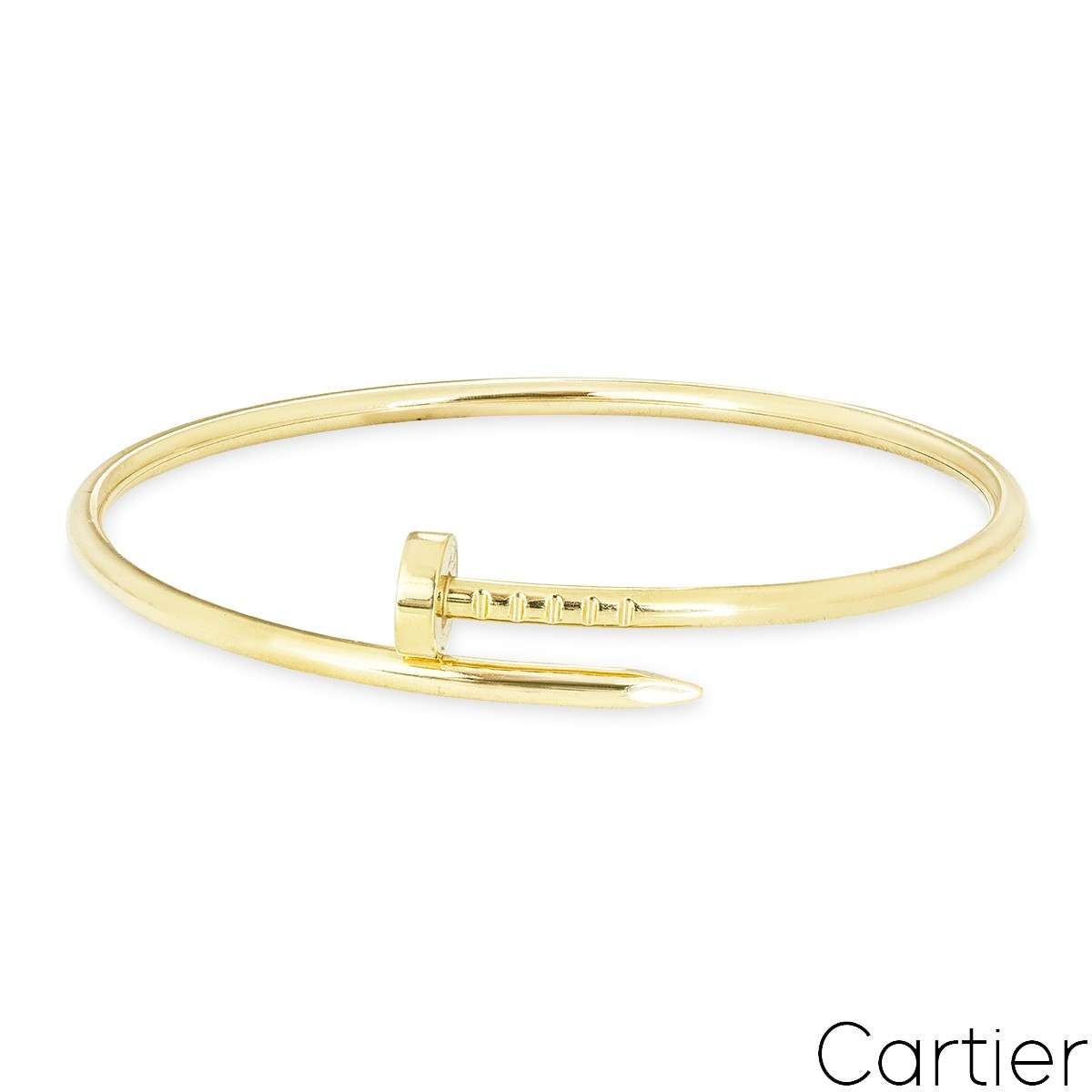 A stunning 18k yellow gold Cartier bracelet from the Juste Un Clou collection. This is the slimmer version of the iconic design, featuring a nail motif that wraps elegantly around the wrist. It has a flexible, clasp-free mechanism where the nail opens and closes seamlessly, giving it a sleek and modern look. The small size is lighter and more delicate compared to the regular version. The bracelet is a size 16 and has a gross weight of 9.6 grams.