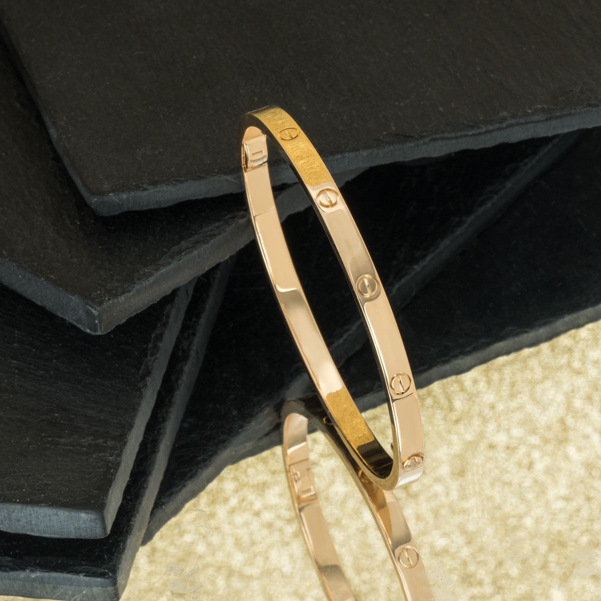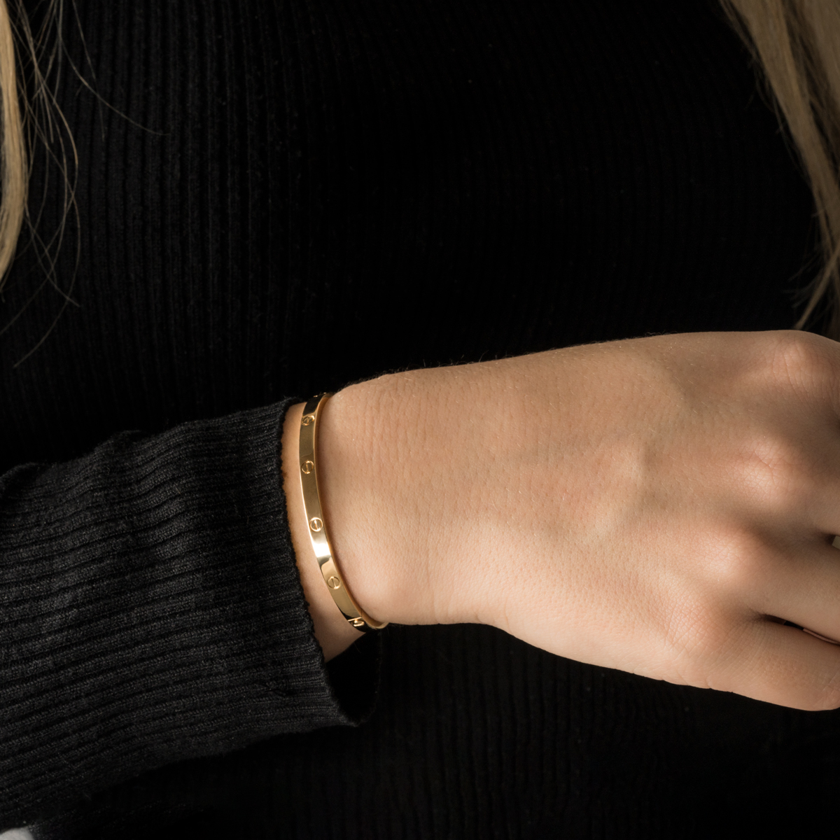 A timeless 18k yellow gold Cartier bracelet from the Love collection. This slimmer version of the classic Love bracelet comprises of the iconic screw motifs and features a single screw and hinge fitting. The bracelet is a size 17, measures 3.65mm in width and has a gross weight of 17.7 grams.