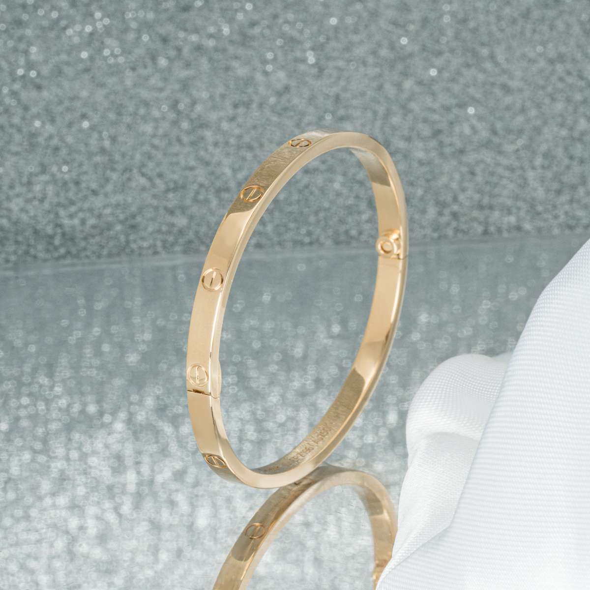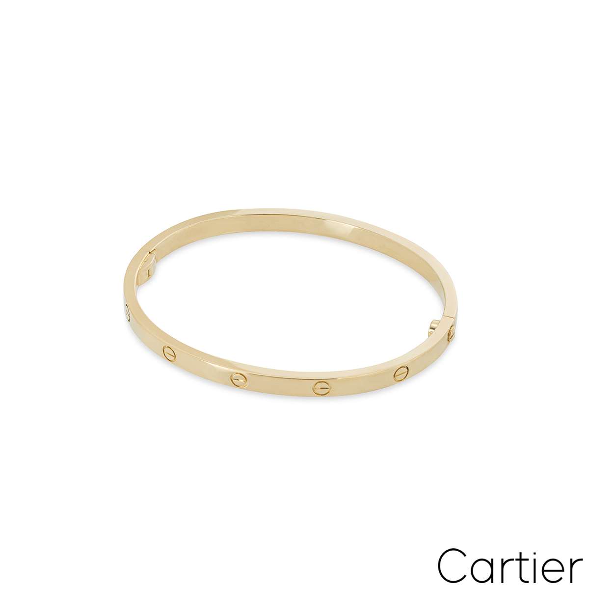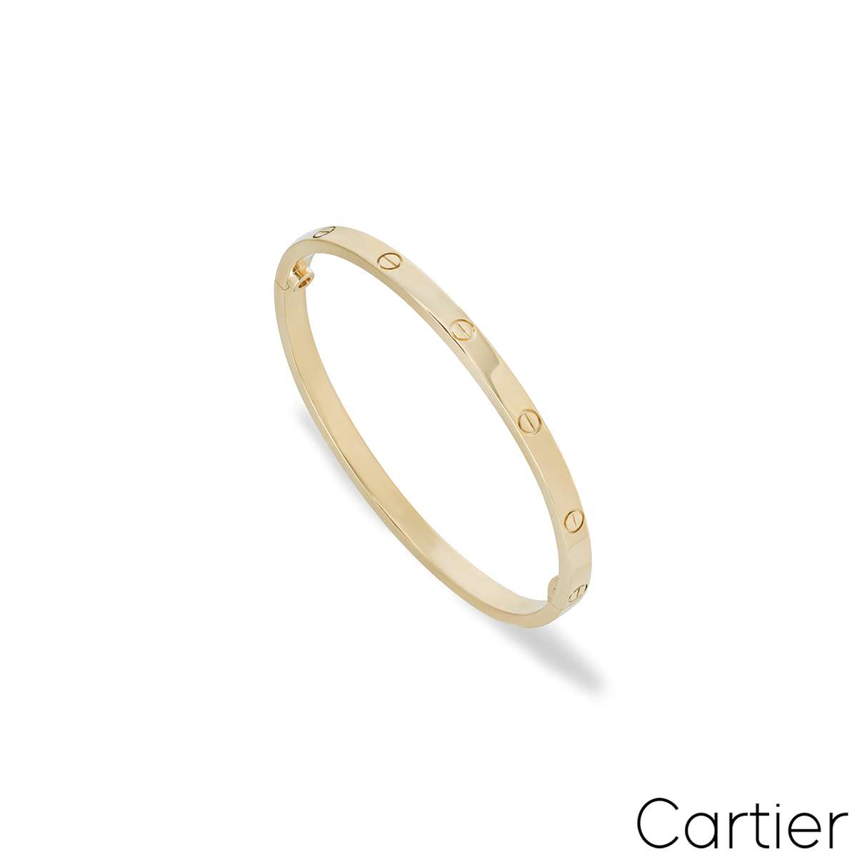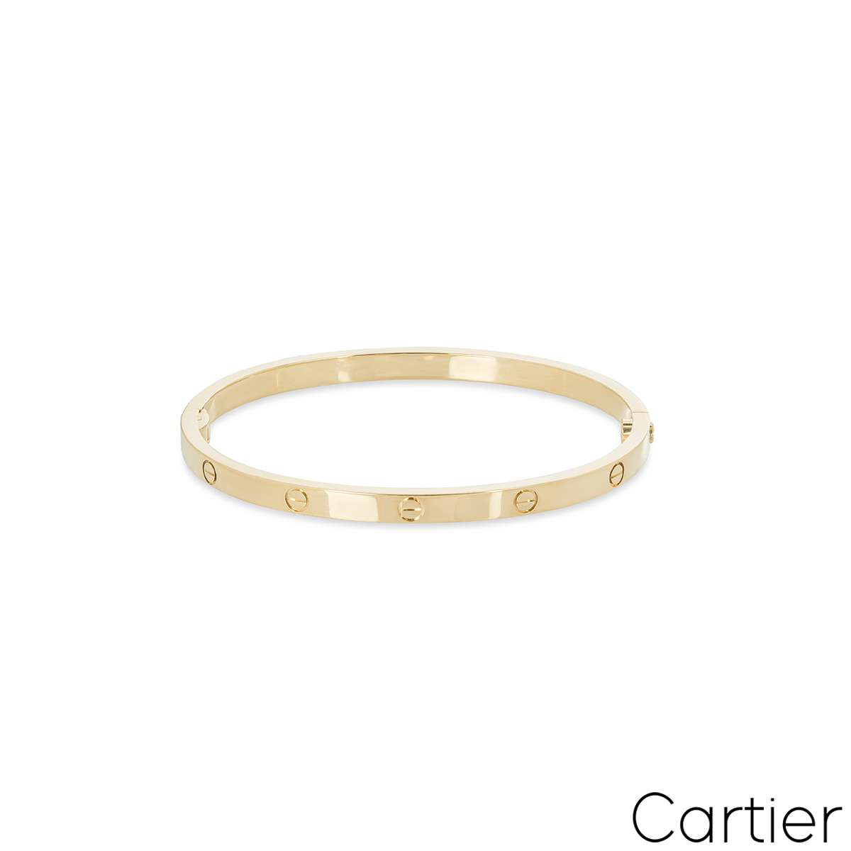 A timeless 18k yellow gold Cartier bracelet from the Love collection. This slimmer version of the classic Love bracelet comprises of the iconic screw motifs and features a single screw and hinge fitting. The bracelet is a size 18, measures 3.65mm in width and has a gross weight of 19.60 grams.