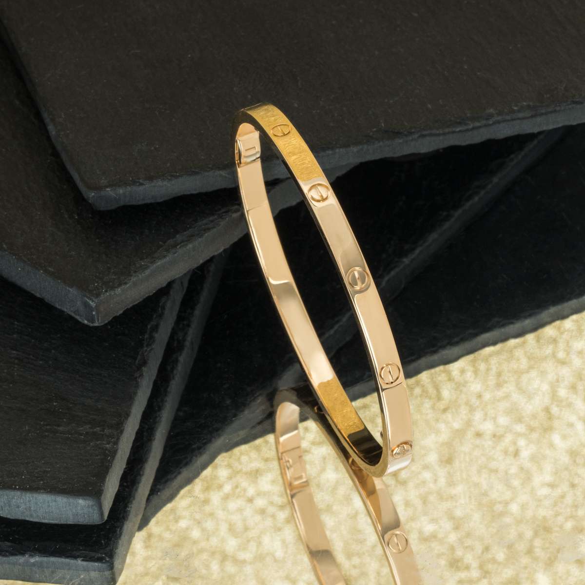 A timeless 18k yellow gold Cartier bracelet from the Love collection. This slimmer version of the classic Love bracelet comprises of the iconic screw motifs and features a single screw and hinge fitting. The bracelet is a size 19, measures 3.65mm in width and has a gross weight of 20.70 grams.