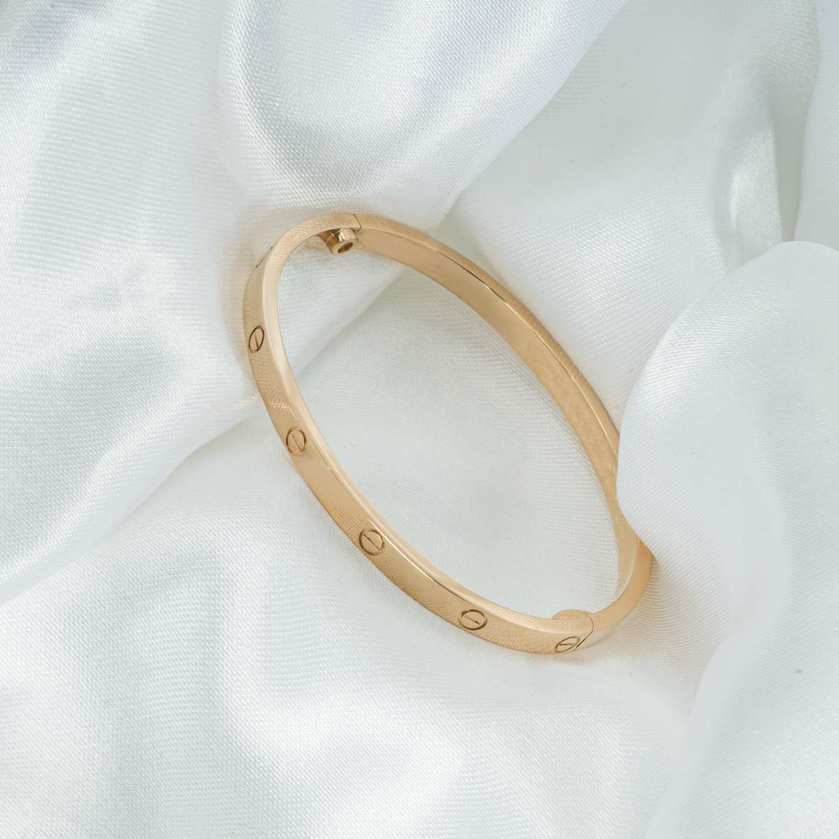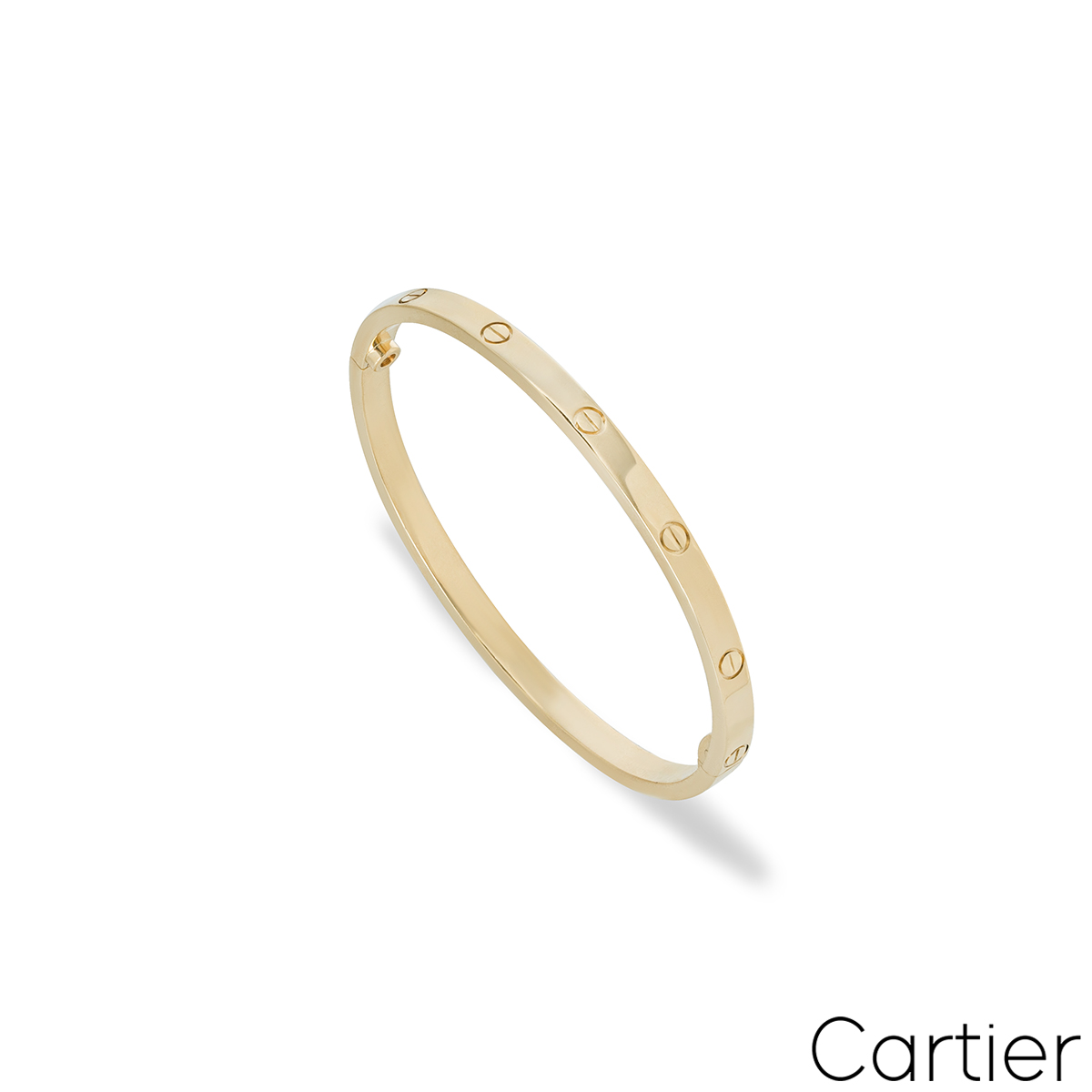 A timeless 18k yellow gold Cartier bracelet from the Love collection. This slimmer version of the classic Love bracelet comprises of the iconic screw motifs and features a single screw and hinge fitting. The bracelet is a size 20, measures 3.65mm in width and has a gross weight of 22.1 grams.