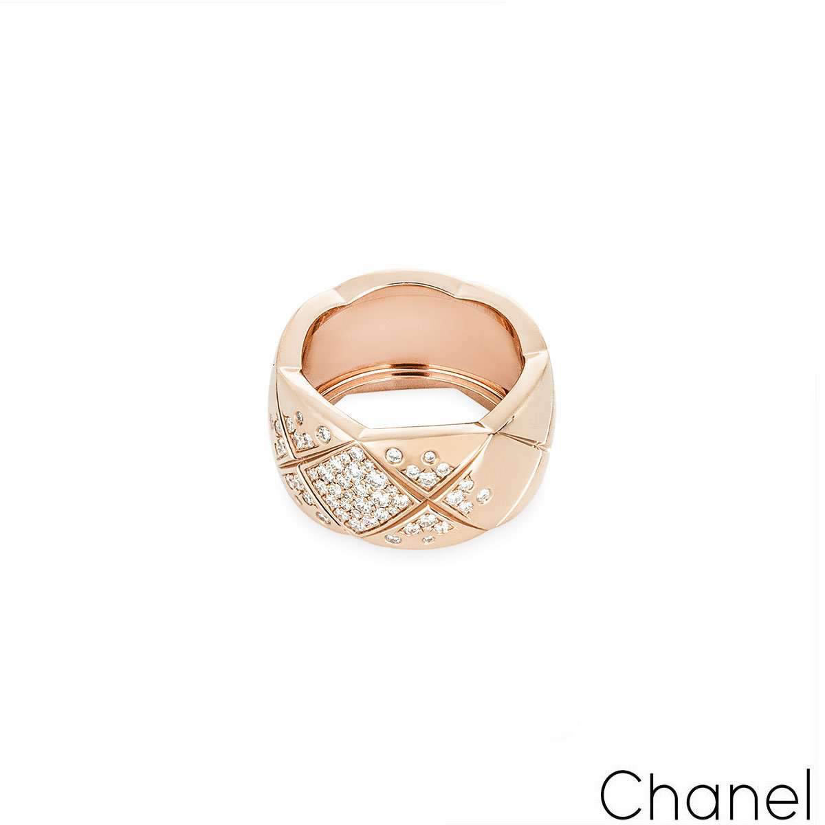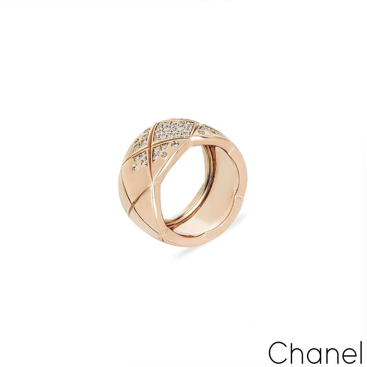 A beautiful 18k beige / rose gold diamond Chanel ring from the Coco Crush collection. The ring features a quilted motif design, with scattered round brilliant cut diamonds. There are a total of 53 brilliant cut diamonds, totalling 0.44ct. The ring is the large version from the collection, its a size 60 and weighs 19.3 grams.
