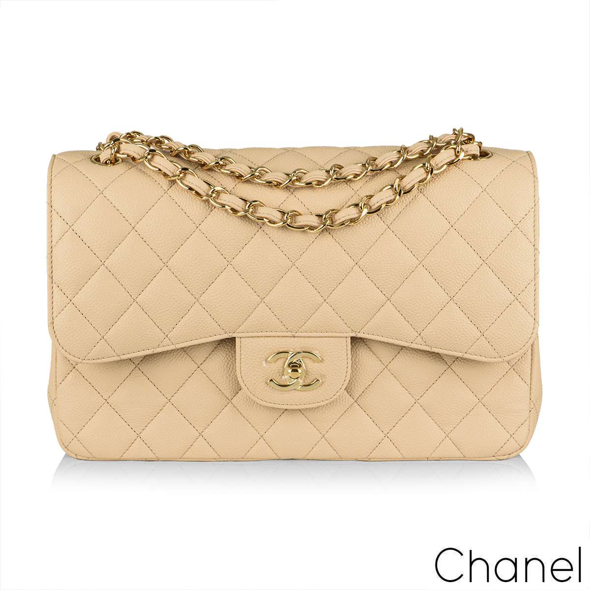 A Timeless Chanel Classic Double Flap Handbag. The exterior of this jumbo classic is in beige caviar leather with gold tone hardware. It features a front flap with signature CC turnlock closure, half moon back pocket, and adjustable interwoven gold tone chain link and beige leather shoulder strap. The interior of this classic bag is lined in cream leather with a "love letter" zipper compartment under the first flap. It is complete with an outer slit pocket under the second flap, and two open pockets separated by a lipstick compartment, in the interior compartment.