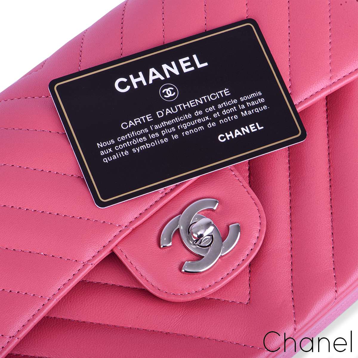 A Chic Chanel Chevron Double Flap Handbag. The exterior of this small classic is in pink lambskin leather with silver tone hardware. This small flap has the signature chevron style stitching. It features a front flap with signature CC turnlock closure, half moon back pocket, and adjustable interwoven silver tone chain link and pink leather shoulder strap. The interior of this classic bag is lined in pink leather with a "love letter" zipper compartment under the first flap. It is complete with an outer slit pocket under the second flap, and two open pockets separated by a lipstick compartment, in the interior compartment.