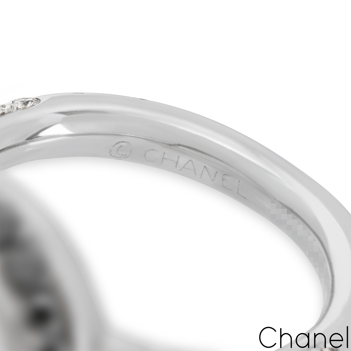 A beautiful platinum pearl and diamond ring by Chanel. The ring is set to the centre with a 12mm single white pearl, complemented by a half halo of 13 round brilliant cut black diamonds. Pave set to the shoulders are 44 round brilliant cut diamonds with an approximate total weight of 0.44ct, F-G colour and VS clarity. The 2.8mm ring has a gross weight of 9.80 grams and is currently a size H but can be adjusted for a perfect fit.