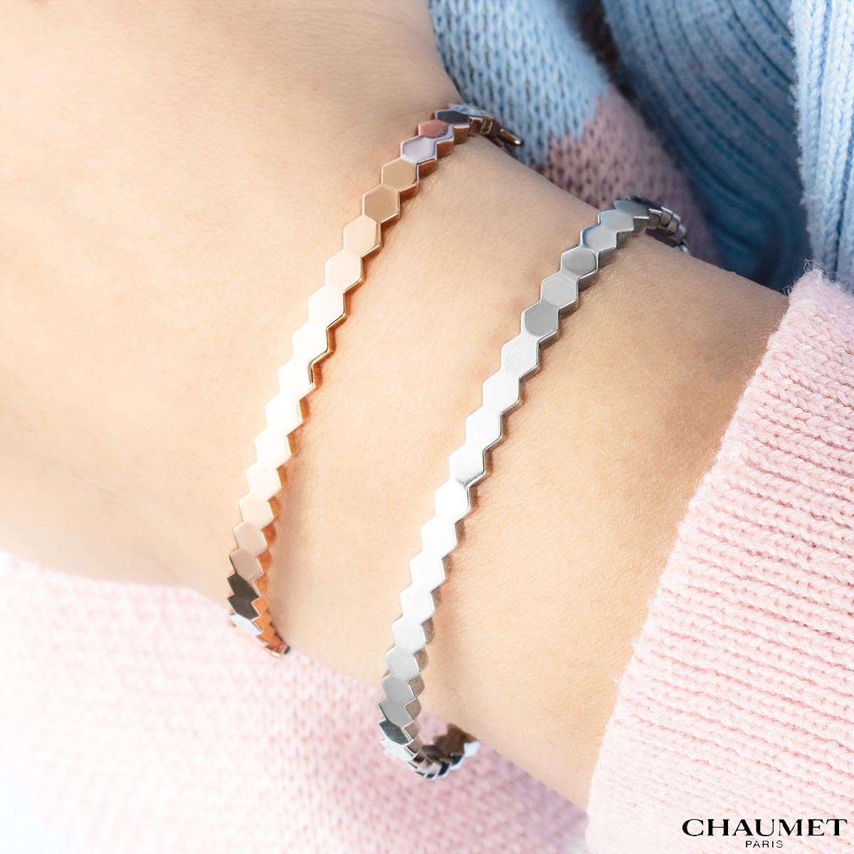 An 18k rose gold Chaumet bracelet from the Bee de Chaumet collection. The bracelet showcases the collection’s signature honeycomb‑inspired design, crafted with exceptional precision. This piece measures 4mm in width, fits a wrist size of up to 16cm and has a gross weight of 14.5 grams.