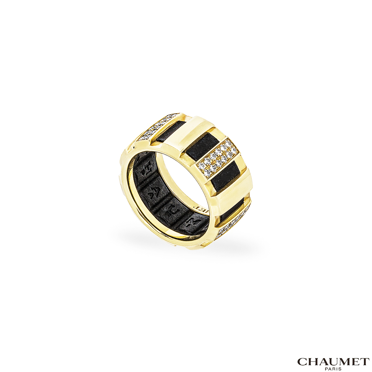 An 18k yellow gold diamond dress ring by Chaumet. The ring features 159 round brilliant cut diamonds set in a crossover pattern throughout with an approximate total weight of 1.27ct, F-G colour and VS clarity. The 8.75mm ring tapers down to 5.22mm, is a size N and has a gross weight of 12.82 grams.