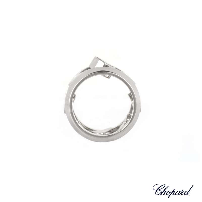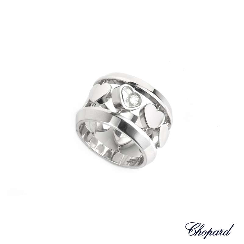 An 18k white gold Chopard Happy Amore ring. The ring is comprised of two teminations which are joined in the middle by eight mobile heart links. Seven of the links are solid hearts whilst one has the signature Chopard floating diamond totalling 0.05ct. The ring is currently a size 53. The ring comes complete with the original Chopard box and Chopard papers, undated.