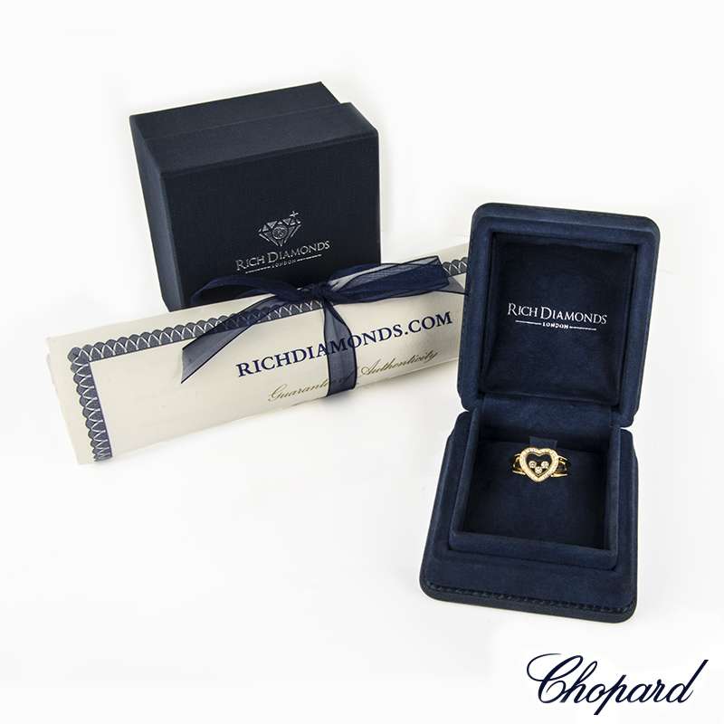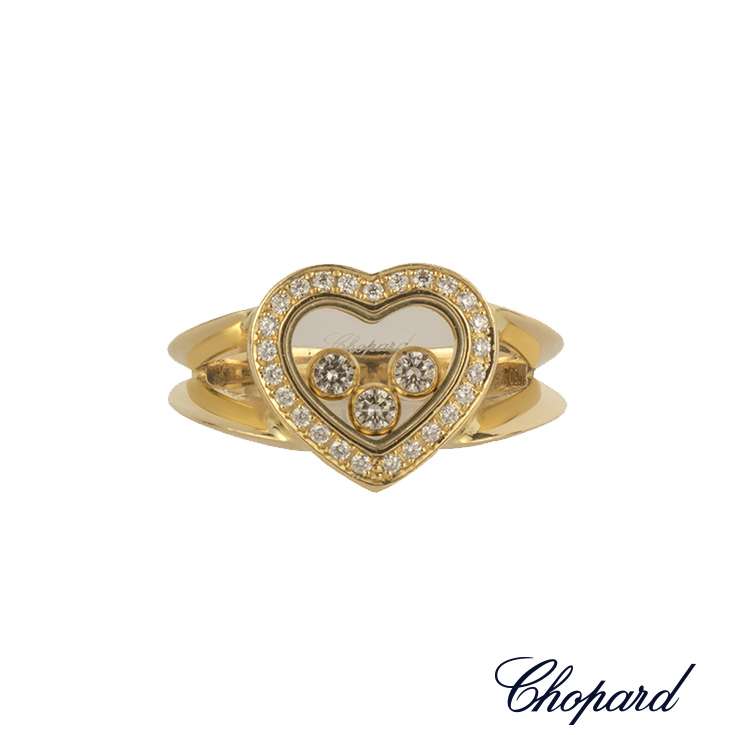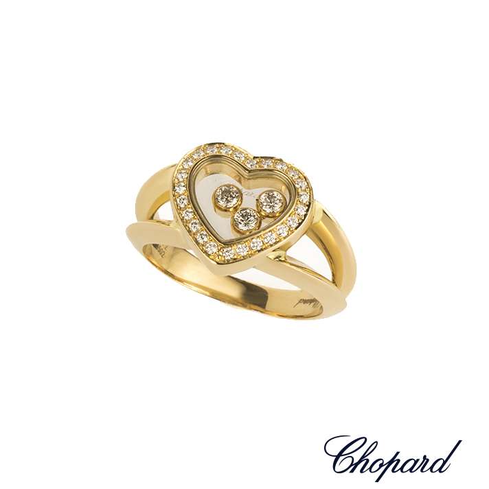 An 18k yellow gold Happy Diamonds ring by Chopard. The heart shape ring consists of 25 round brilliant cut diamonds surrounding the outer edge totalling 0.12ct, with 3 round brilliant cut diamonds floating in the centre totalling 0.15ct. The ring has a split shank and is a size S 1/2.
