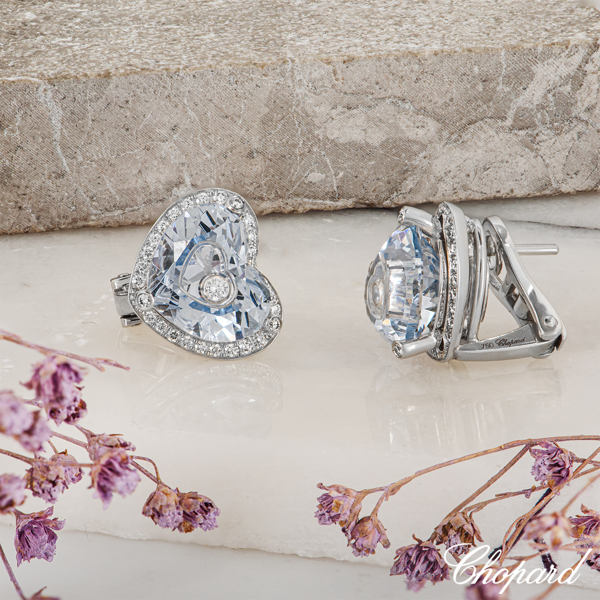 A beautiful pair of 18k white gold earrings by Chopard from the So Happy collection. The blue heart shaped earrings are set to the centre in a 3 prong mount adorned with round brilliant cut diamonds at the tips. Encased in the blue stone, behind the iconic signed Chopard glass is a single bezel set floating round brilliant cut diamond weighing 0.05ct. Accentuating the heart motif is a halo of 24 round brilliant cut diamonds with a combined total weight of 0.32ct. The earrings measure 15mm x 13mm, finish with post and omega back fittings and have a gross weight of 11.90 grams.