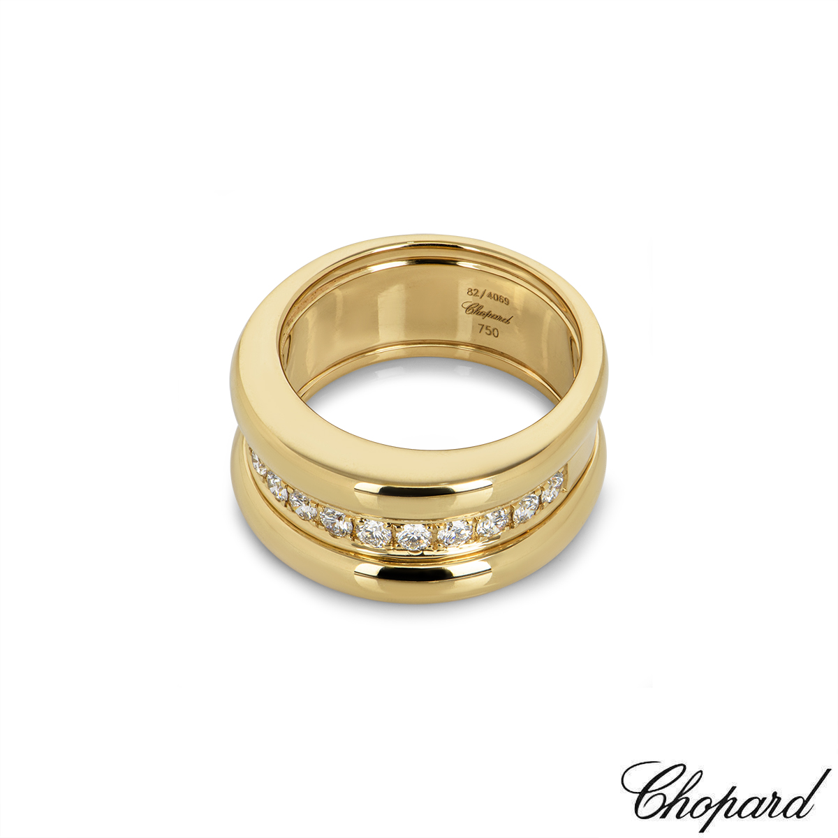 A classic 18k yellow gold diamond ring by Chopard from the La Strada collection. The ring is set to the centre with a row of 13 round brilliant cut diamonds with a total approximate weight of 0.50ct, complemented by a polished domed border set to the outer edges. The ring measures 10mm wide, is a size O and has a gross weight of 14.89 grams.