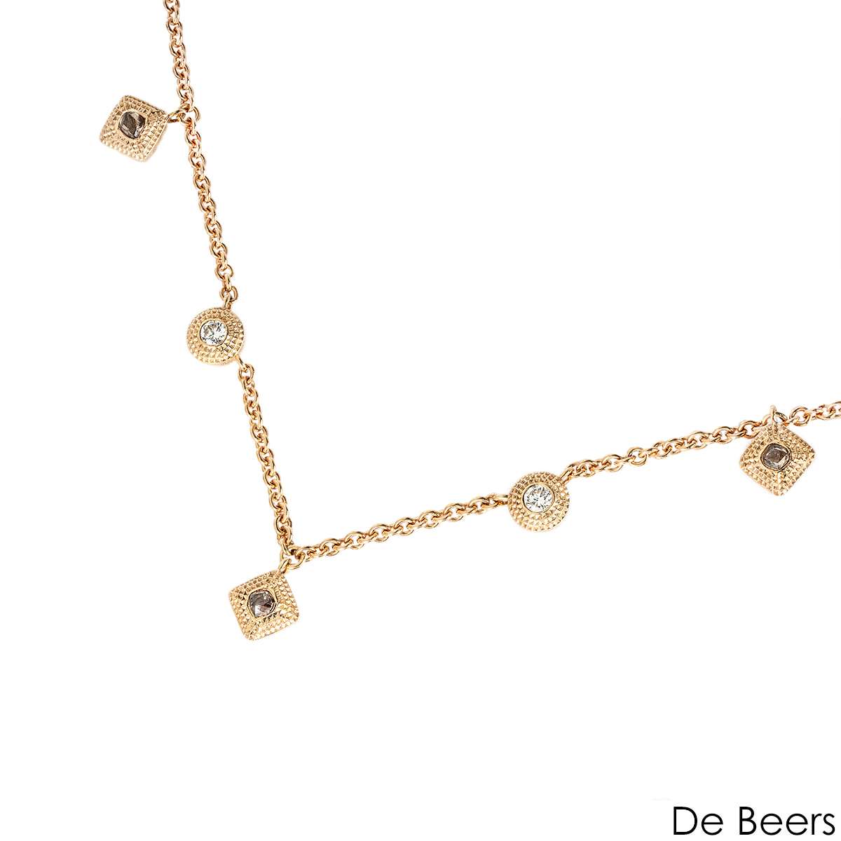 A beautiful 18k rose gold necklace by De Beers, from their Talisman collection. The necklace features 5 textured charms, each set with rough and polished diamonds with an approximate total weight of ~0.34 carats, G+ colour and VS+ clarity. Measuring 16.5"/ 42cm with adjustable length loops at 14"/ 36cm and 15.25" / 39cm, all secured by a signed lobster clasp. The total gross weight of the piece is 9.8 grams.