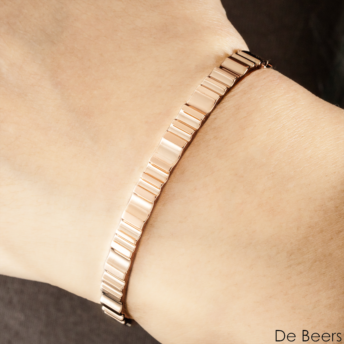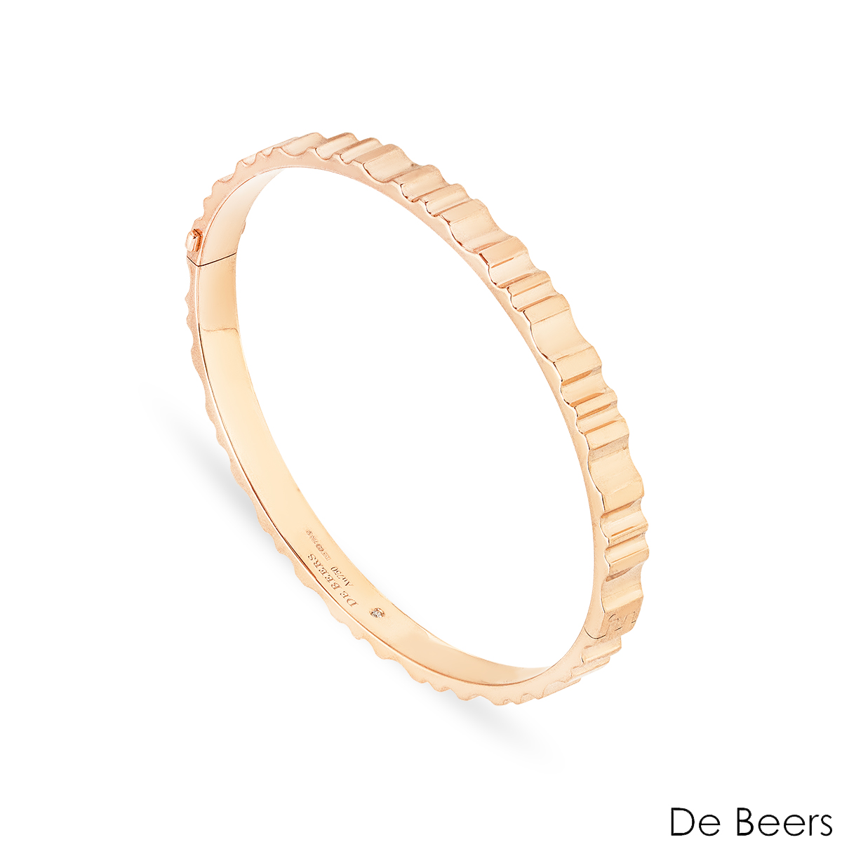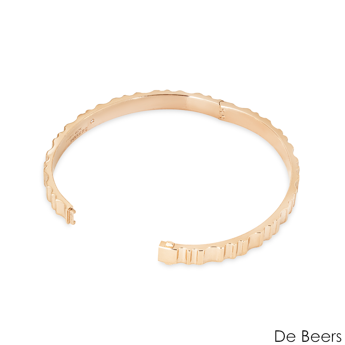 An 18k rose gold De Beers bracelet from RVL collection. The bracelets design was inspired by the De Beers monogram, whilst featuring a hidden diamond on the inside. This piece measures 5mm in width, fits a wrist size of up to 15cm and has a gross weight of 22.2 grams.