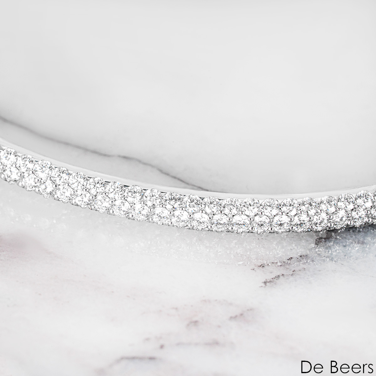 An elegant 18k white gold diamond bangle by De Beers from the Classics collection. The bangle features 162 micropavé set round brilliant cut diamonds totalling 2.03ct, predominately F-G colour and VS+ clarity. The bangle fits a wrist up to 16cm, finishes with a hinged box clasp with an additional figure 8 fitting for extra security and has a gross weight of 19.2 grams.