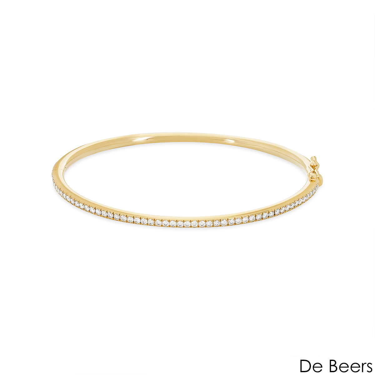 A timeless 18k yellow gold diamond bangle by De Beers from the Classics collection. This bangle features 52 micropavé set round brilliant cut diamonds totalling 0.64ct, predominately F-G colour and VS clarity. The bangle fits a wrist size of up to 16cm, finishes with a hinged box clasp with an additional figure 8 fitting for extra security and has a gross weight of 13.4 grams.