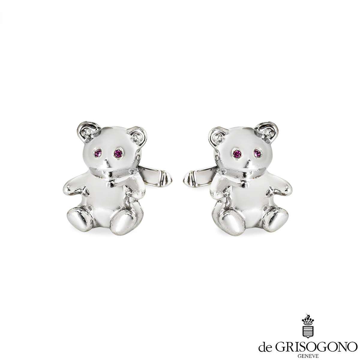 A pair of 18k white gold teddy bear cufflinks by De Grisogono. Each cufflink is set with a pair of rubies representing the bear's eyes, feature a t-bar fitting, and measure 20mm in height. The cufflinks have a total gross weight of 27.2 grams.