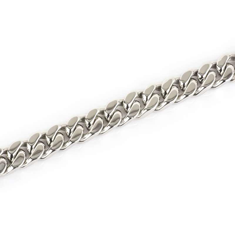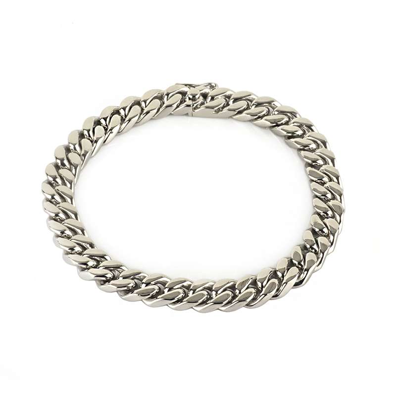A large gents curb link bracelet in platinum. The bracelet measures 8.5 inches in length and has a tongue clasp with a safety clip on the side. The gross weight is 84.51 grams.