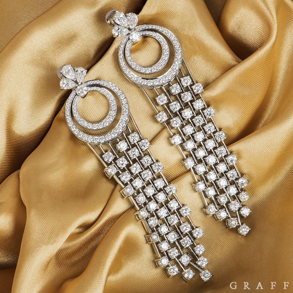 A pair of 18k white gold diamond set drop earrings by Graff. The earrings are each composed of 3 pear shaped diamonds at the top with two circular openwork motifs, one inside the other set with pave round brilliant cut diamonds and suspended beneath are 7 rows of claw set round brilliant cut diamonds giving the effect of a waterfall. The pear shaped diamonds have an approximate total weight of 3.60ct and the round brilliant cut diamonds have an approximate weight of 13.67ct. The earrings feature post and clip fittings with a length of 3.5 inches and width of 0.91 inches. The earrings have a gross weight of 55.6 grams.