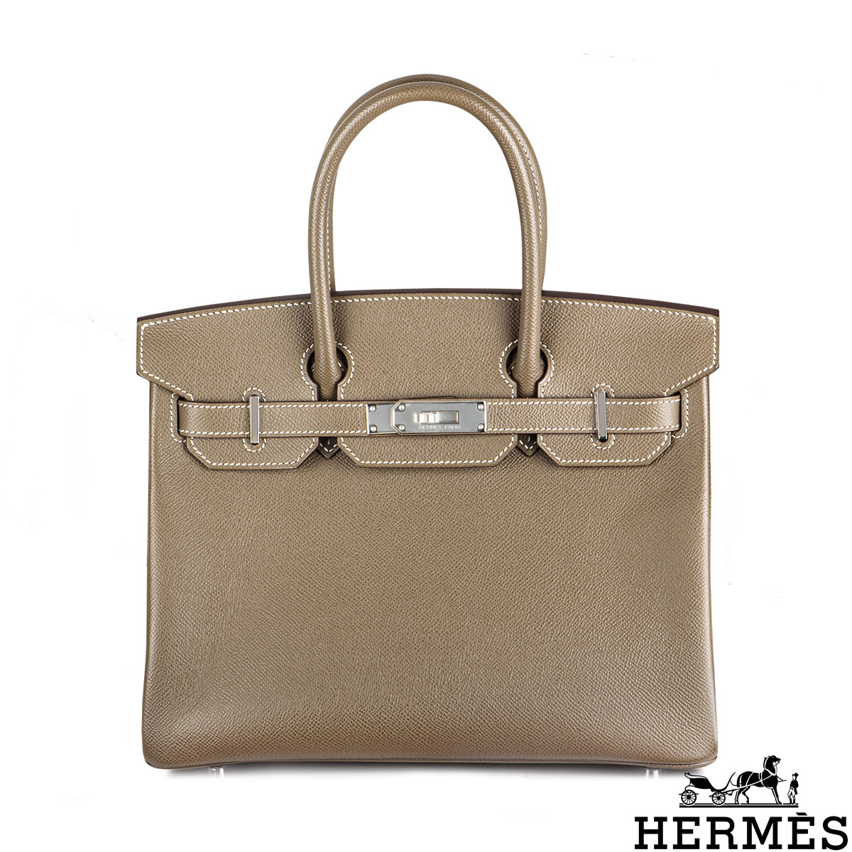 A classic Hermès 30cm Birkin bag. The exterior of this Birkin is in Etoupe Veau Epsom leather with white stitching. It features palladium hardware with two straps and front toggle closure. The interior has a zip pocket with an Hermès engraved zipper pull and an open pocket on the opposite side.
