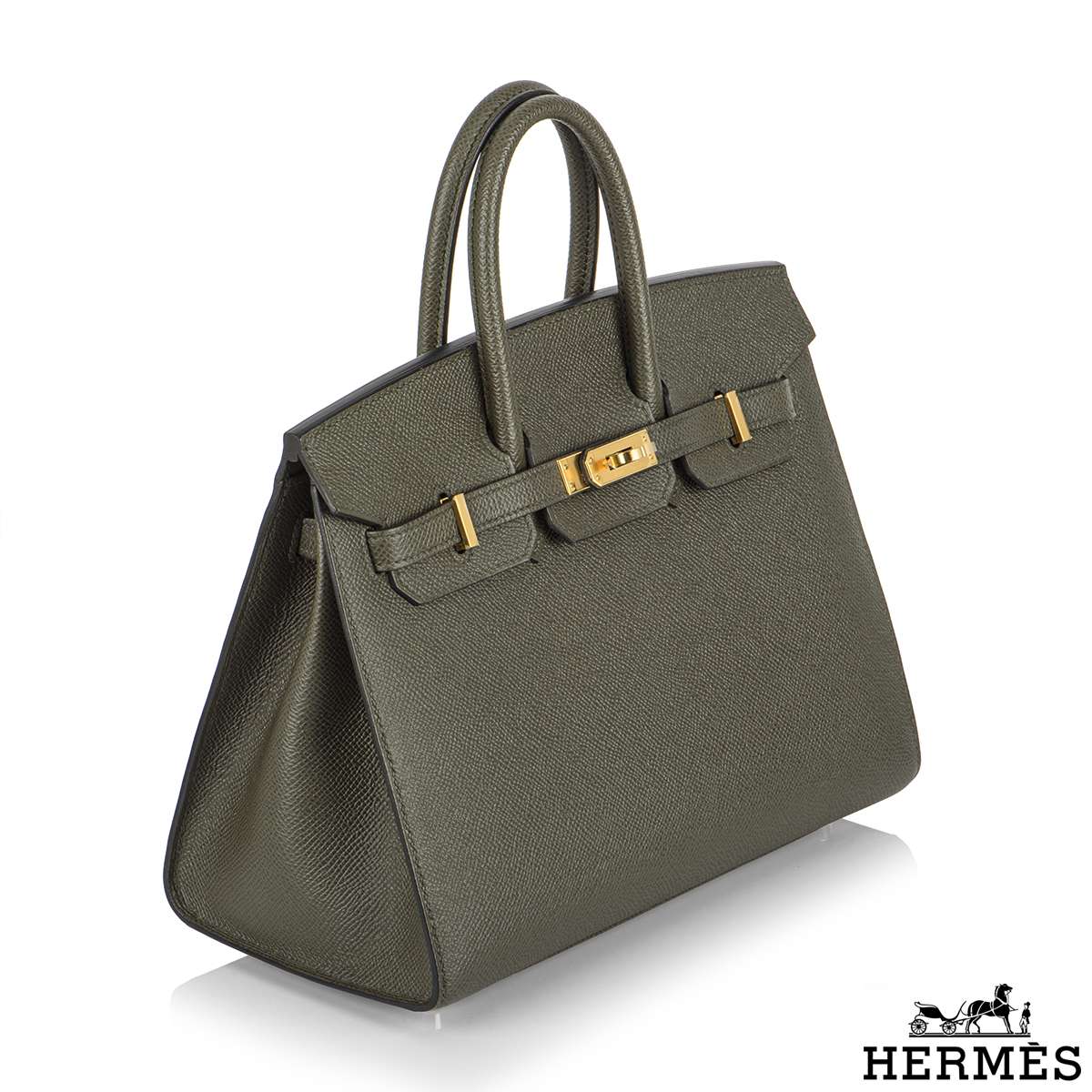A gorgeous Hermès Birkin Sellier 25cm Vert de Gris bag. The exterior of this birkin is in vert de gris Epsom leather with tonal stitching. It features gold tone hardware with two straps and front toggle closure. The interior is lined with vert de gris Epsom leather and has a zip pocket with an Hermès engraved zipper pull and an open pocket on the opposite side. This bag is store fresh, full set with factory stickers on all hardware.