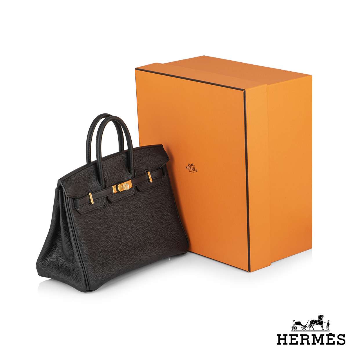 An exquisite Hermès 25cm Birkin bag. The exterior of this birkin is in black togo leather with tonal stitching. It features gold tone hardware with two straps and front toggle closure. The interior is lined with black chevre and has a zip pocket with an Hermès engraved zipper pull and an open pocket on the opposite side. This bag is store fresh, full set with factory stickers on all hardware.