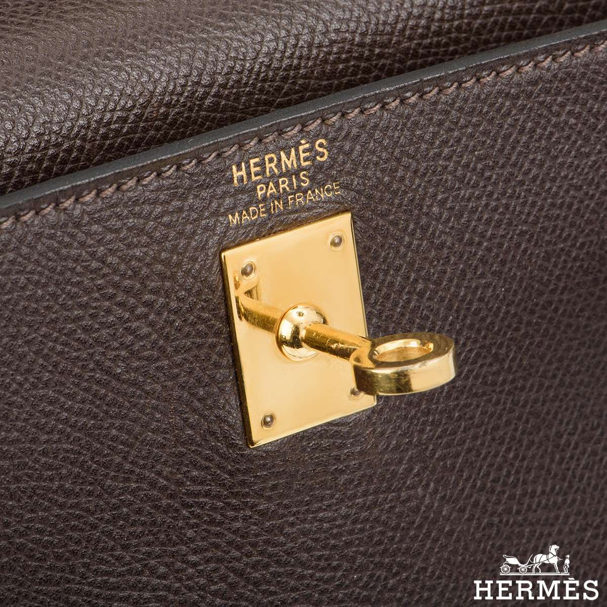 A beautiful vintage Hermès Kelly 25cm Bi colour Handbag. The chocolate brown colour is complemented with orange piping and gold tone hardware. The exterior of this vintage Kelly features a retourne style in chocolate brown leather. It has a front toggle closure, a single rolled handle and tonal stitching. The interior is lined with contrast orange Chevre leather and features one zipped pocket with an Hermes engraved zipper pull and two open pockets on the opposite side.