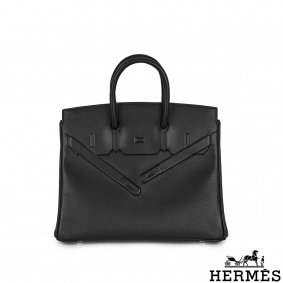 An exquisite Hermès 25cm Birkin bag. The exterior of this birkin is in black togo leather with tonal stitching. It features gold tone hardware with two straps and front toggle closure. The interior is lined with black chevre and has a zip pocket with an Hermès engraved zipper pull and an open pocket on the opposite side. This bag is store fresh, full set with factory stickers on all hardware.