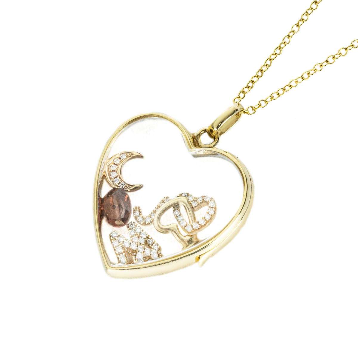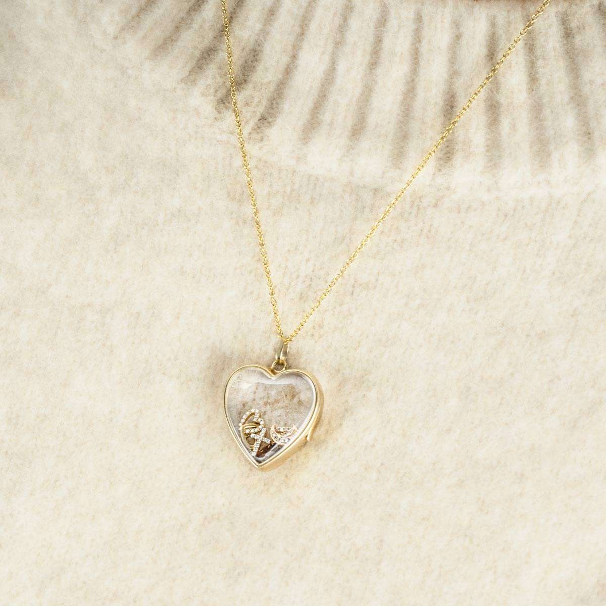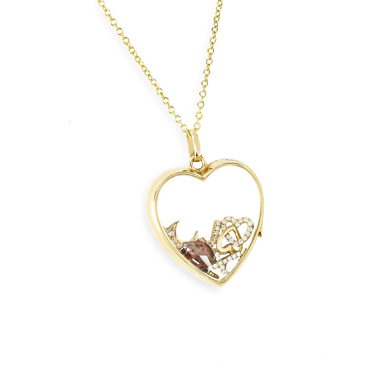 A stunning 14k yellow gold Midi Heart of Gold Locket from Loquet London’s Signature Collection. The heart shaped locket features transparent glass panels on both sides, designed to showcase six Loquet diamond set charms. The piece is suspended from an adjustable 18-inch 14k gold chain, finished with a secure lobster clasp and has a gross weight of 10.5 grams.